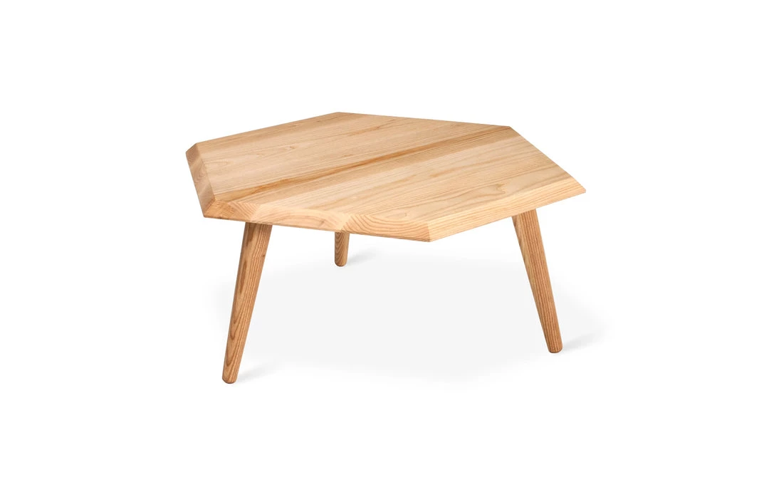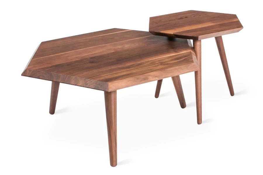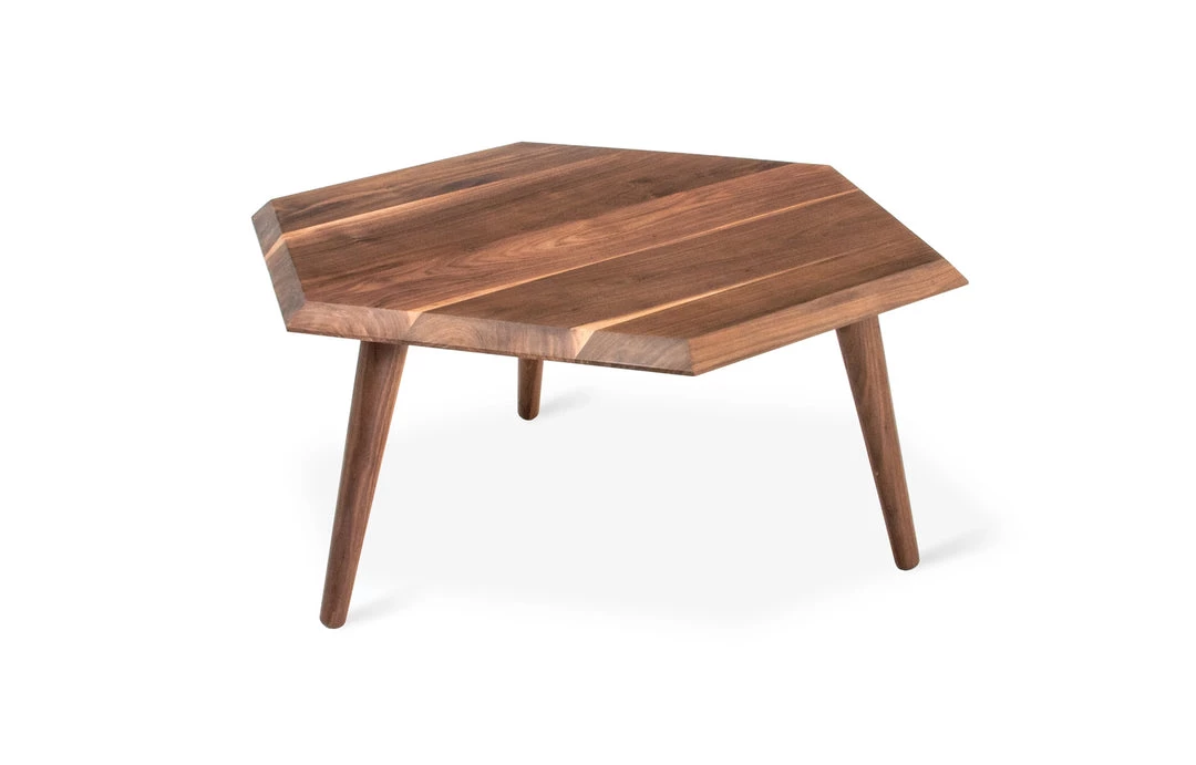 The Metric Coffee Table is a minimalist, geometric accent, crafted with solid Walnut or Ash. The hexagonal top features a bevelled edge and is designed to nest with the Metric End Table.