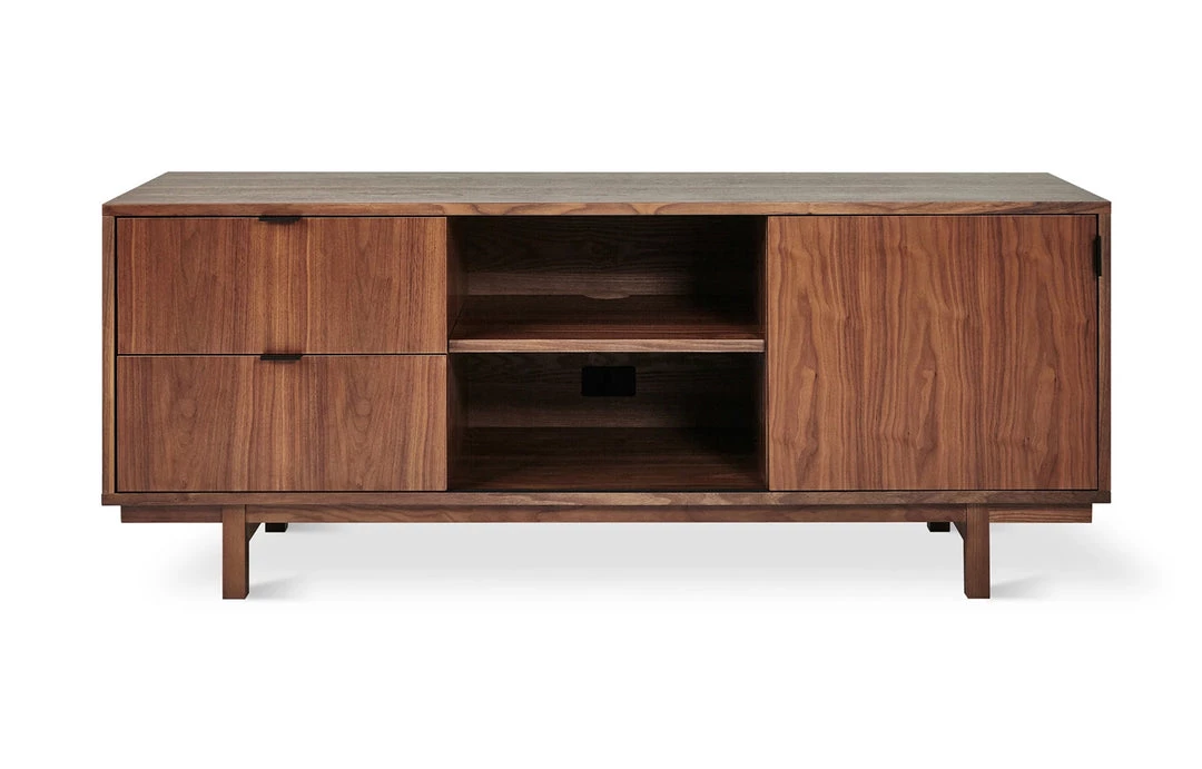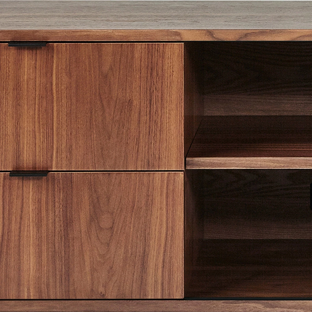 The Belmont Media Stand is an architecturally inspired storage design that features the natural beauty of walnut. Designed for Hi-Fi and media components, a back panel opening in the cabinet allows for concealed cable management. Drawers provide storage to keep your living room uncluttered, while adjustable shelves and a sliding front panel let you reveal or conceal components. The Media Stand is part of the Belmont Storage Series, matching perfectly with the Belmont Credenza and End table.