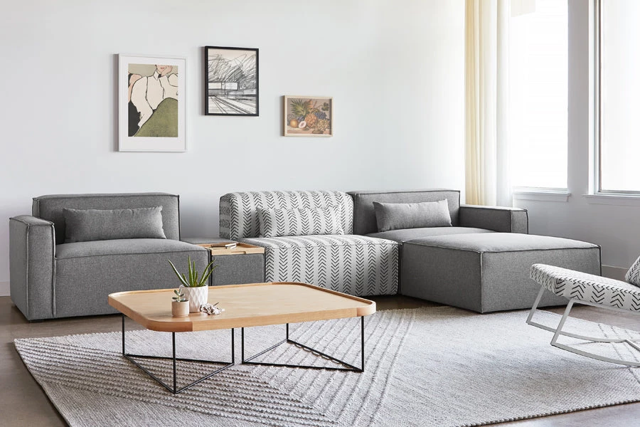 The Mix Modular Collection lets you mix and match components and fabrics to build a custom sectional, sofa or chaise to perfectly suit your space. The design uses 5 basic components (left arm unit, right arm unit, armless unit, corner unit, and ottoman) which can be added and combined to create an unlimited number of upholstery configurations. Choose matching fabrics or mix things up to make it your own. Components can be easily reconfigured or added later to adapt to changing needs. Move an ottoman from the left to the right side of a sectional to change the layout of your space. Build a condo-sized sectional knowing that you can add more components down the road if needs change. The tight seat and back give the design a clean-lined, contemporary look, and each component has French seams to subtly soften the edges. Includes matching bolster cushions for added style and comfort. Constructed with kiln-dried 100% FSC®-Certified hardwood in support of responsible forest management.
