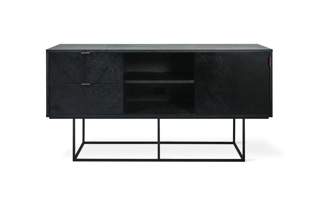 The Myles Media Stand combines subtle details and craftsmanship to create a storage design that exudes simple sophistication. A drawer features rose gold handles contrasting dark stained, chevron-patterned oak faces. A recessed, slender steel base with black, powder-coated finish creates an illusion of weightlessness. Designed for Hi-Fi and media components, a back panel opening in the cabinet allows for concealed cable management. Drawers provide storage to keep your living room uncluttered, while adjustable shelves and a sliding front panel let you reveal or conceal components. Part of the Myles Storage Series, this Media Stand matches perfectly with the Myles Credenza and End Table.