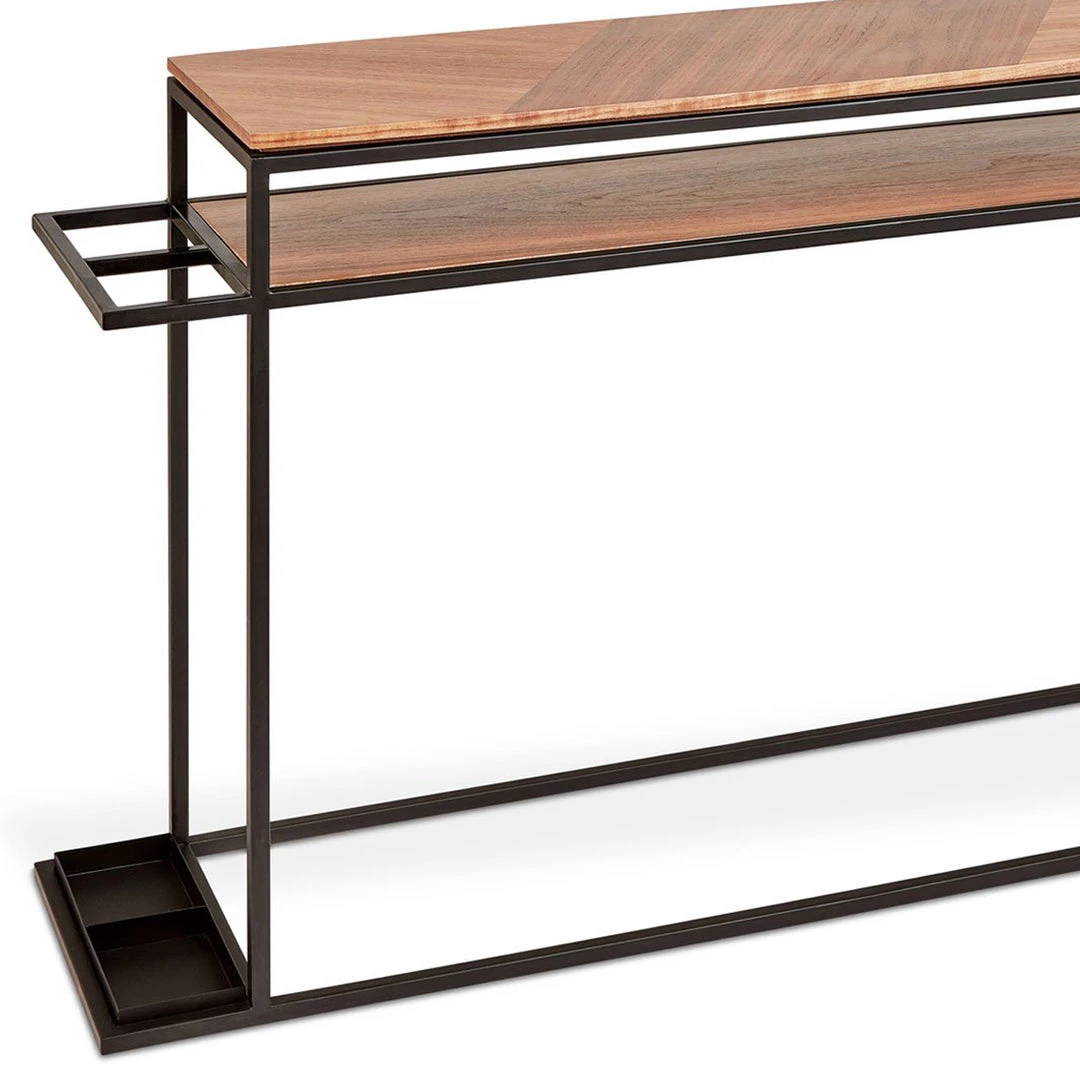 The Tobias Console Table is a minimalist, geometric accent piece well suited for modern spaces. The rectangular top features a dynamic arrangement of wood grain panels, which rest on a slim, solid steel base. A subtle reveal along the table edge creates the illusion of a floating top. The table features an inset shelf for additional storage space, and a metal side extension that offers space-saving storage solutions for umbrellas and accessories. The table’s slender, compact form is perfect for entryways and other smaller spaces where every square foot counts