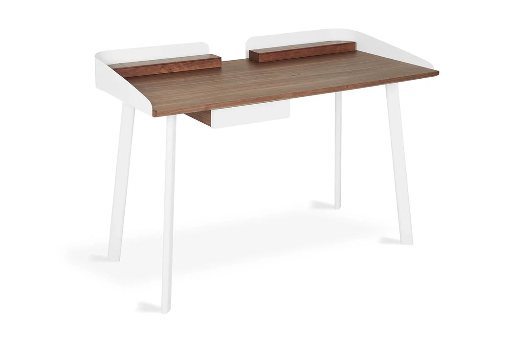 The Gander Desk is a compact, minimalist design that offers a stylish and functional spot to get work done and store essential items. It features magnetized, solid walnut storage compartments to conceal stationary supplies, and a drawer to keep notebooks and clutter out of sight. White, powder-coated steel legs and a bent-metal perimeter detail contrast beautifully with the warm woodgrain top.
