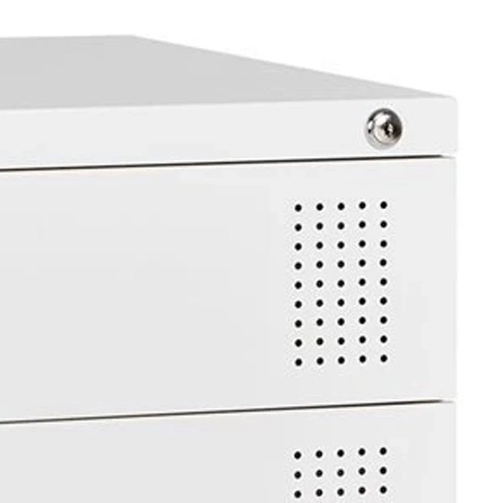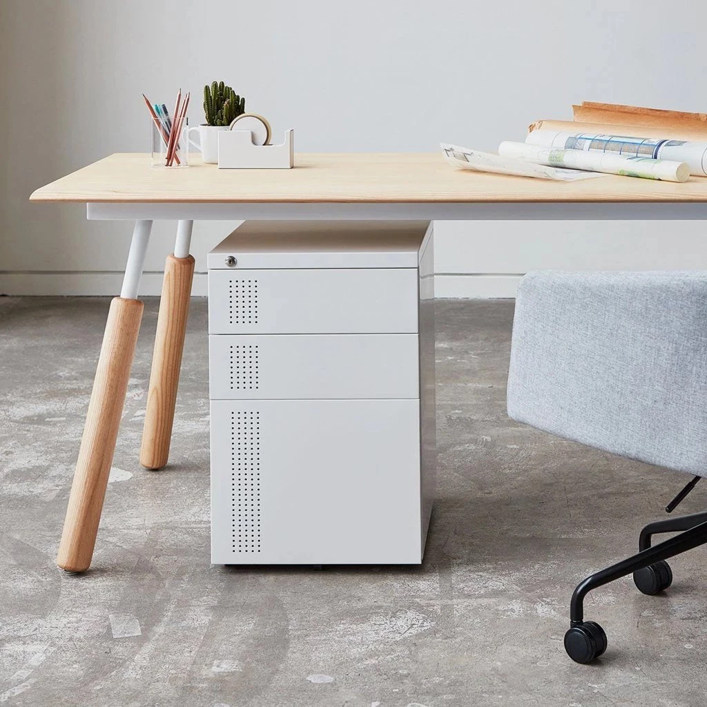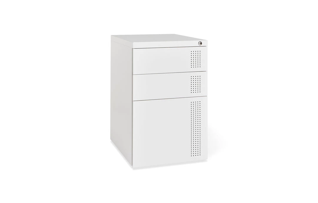 Combining playful detail with serious storage capability, the Perf File Cabinet offers simplicity in both form and function. The lockable, three-drawer file cabinet features ample space for documents and personal items, including a top-drawer tray for smaller stationary items. Castor wheels and a compact design allow it to glide effortlessly under standard desks like the Envoy Desk, making it easy to keep your space open and tidy. A delicate perforated detail adds subtle interest to this sleek and classic piece.