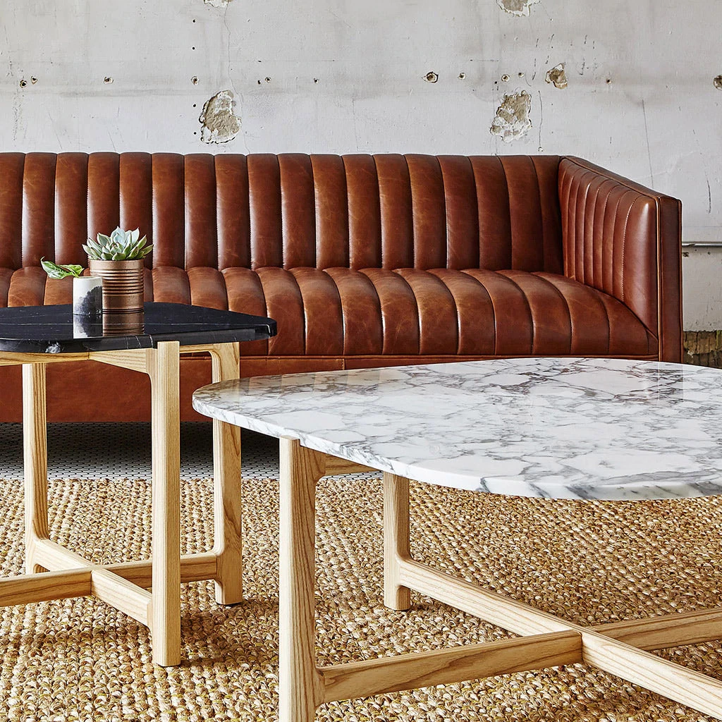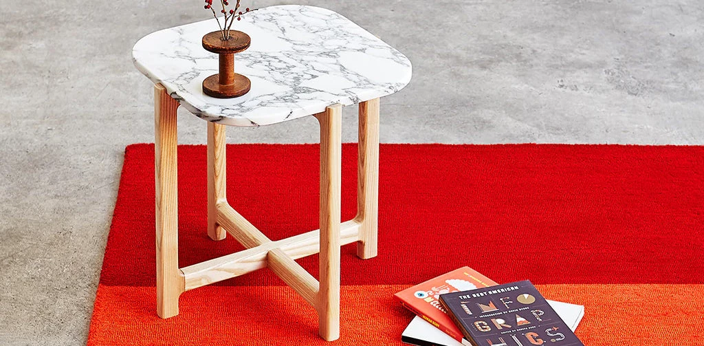 The Quarry End Table is a minimalist take on casual sophistication, designed to showcase the beauty of natural marble and wood grain. The thick marble top has rounded corners to soften the look, and a solid-wood cross base reinforces this aesthetic with rounded edges and elegant joinery details. Available in a choice of four colors, each marble top has unique, natural veining which make each table a one-of-a-kind.