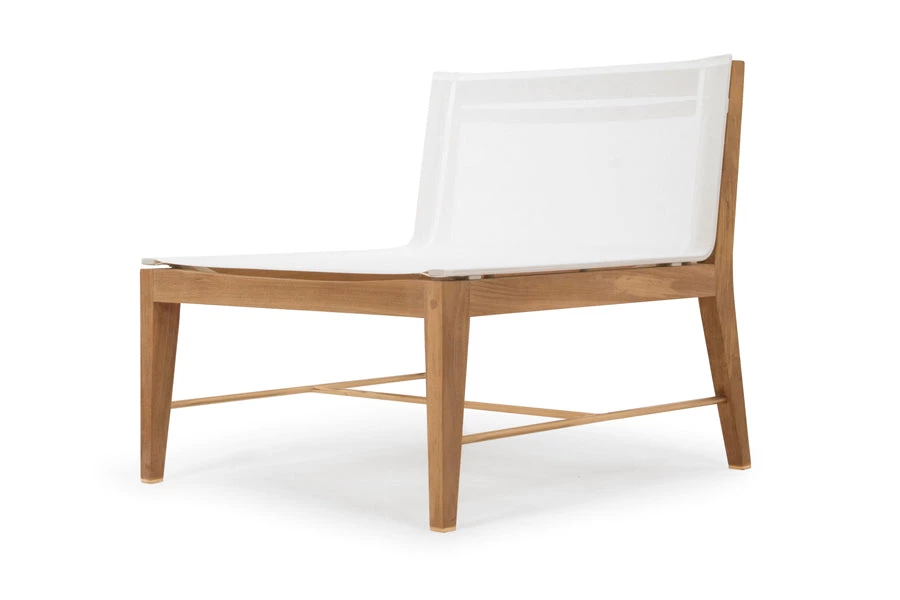 The Byron single seat armless chair is characterized by a streamlined design. It features exquisitely detailed Ferrari Batyline mesh upholstery, Indonesian teak frame, and a structural brass runner for support and style. Its strong wooden frame provide this chair with maximum functionality, not only for the home but also for bars, restaurants and organizations. Suitable for furnishing the dining room and public spaces with class.