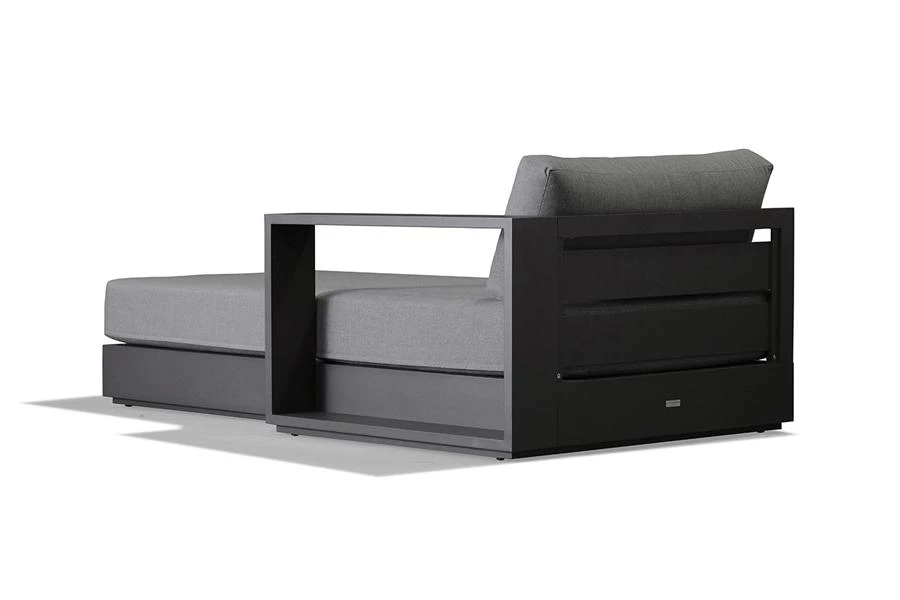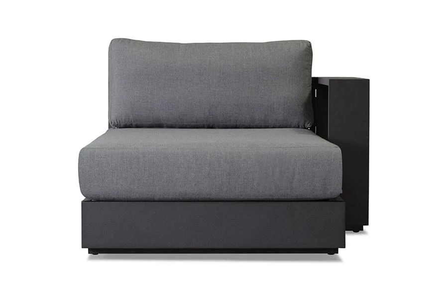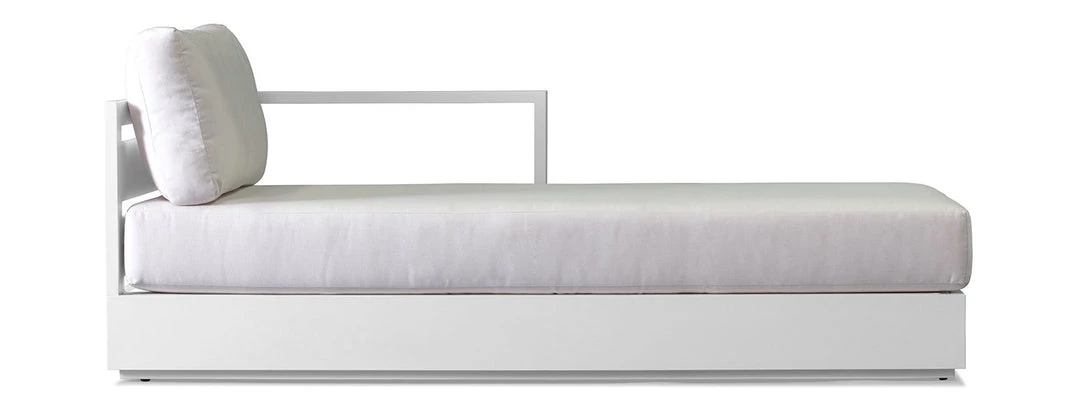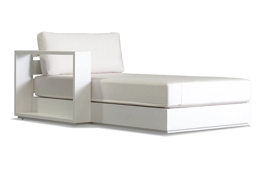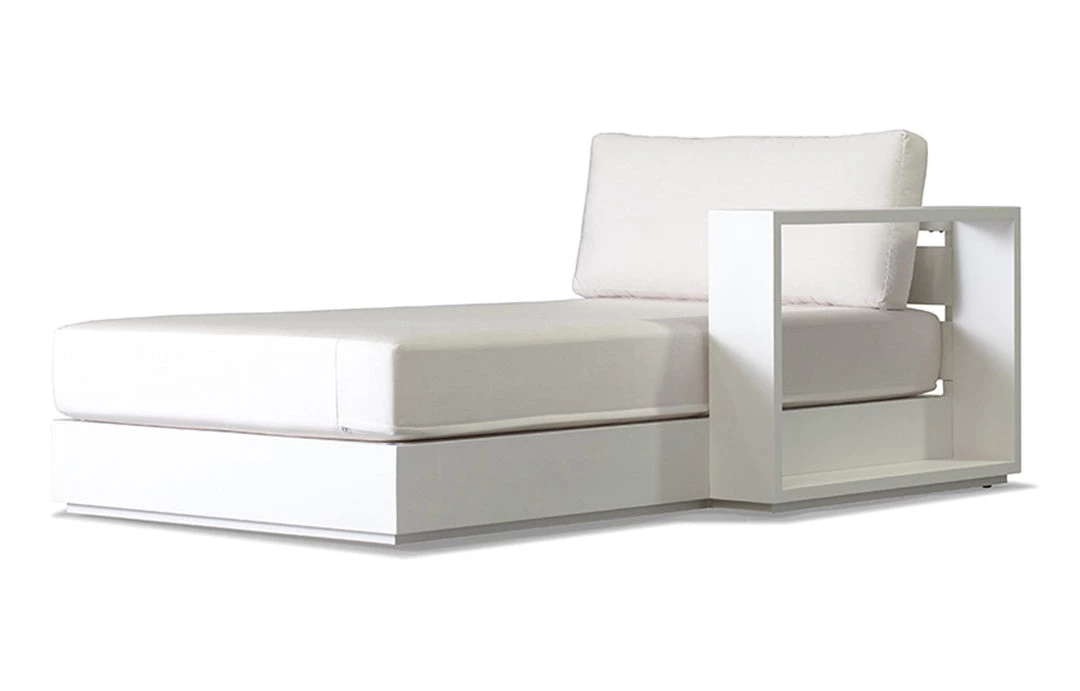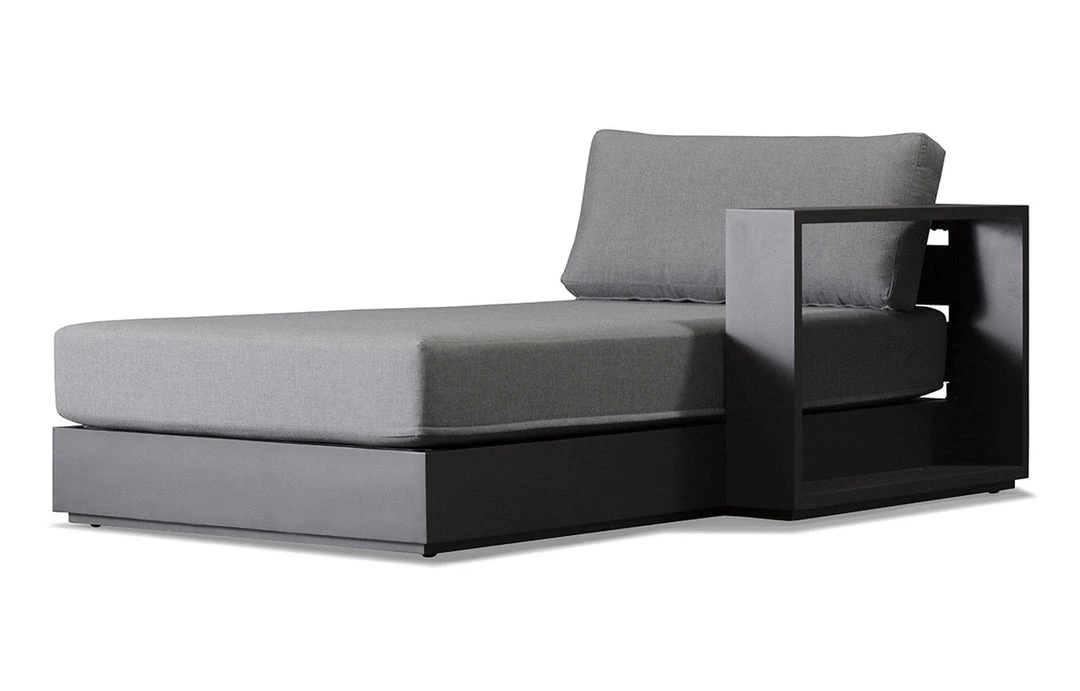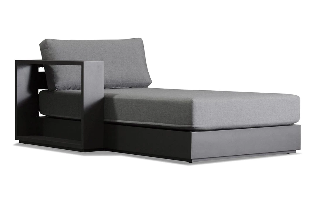 The Hayman sectional chaise is a modular seating unit for creating unique outdoor sectionals for all day lounging. The contemporary appeal makes this chaise ideal for the modern patio living space. This piece is noted for its refined simplicity and back to basics structural design. It incorporates a solid aluminum frame in a unique powder-coated Asteroid or White finish that will not rust and provides sturdy support. It is also outfitted with back and seat cushions upholstered in weather-resistant Sunbrella fabric.
