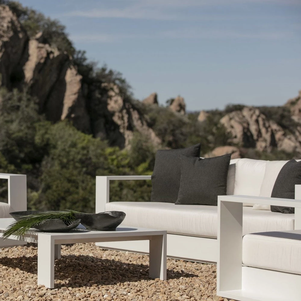 The Hayman three-seater sofa is an elegant sofa built for the outdoor patio. It defies the typical look of an outdoor furniture with its hard-wearing powder coated aluminum frames combined with thick and comfortable cushion seating. The neutral shades of the frame and fabric in this sofa make this an understated beauty that would withstand the test of trends. It comes with a full-length seat cushion and back cushions which are covered in a weather-resistant Sunbrella fabric. Shop the Hayman two-seater outdoor sofa or mix and match with other pieces from the Hayman range to create your ideal outdoor furniture set.