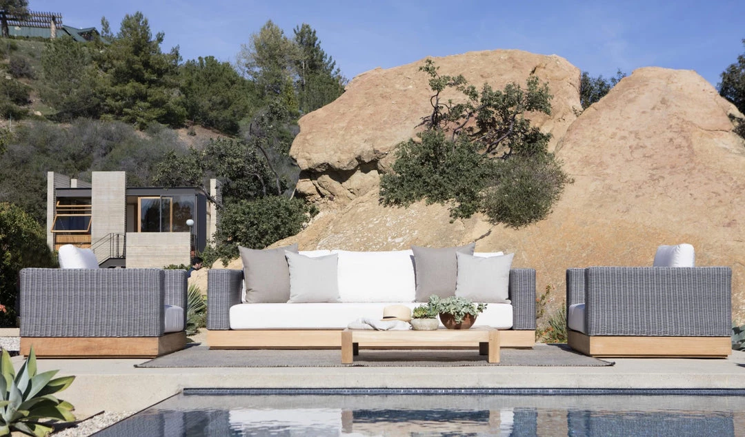 The Malabar Arm Chair has a solid, A-grade Indonesian teak wood base with All-Weather wicker frame and a Sunbrella upholstered seat cushion. Despite its natural design, the wicker arm chair has a very elegant dimension – ideal for our patio or garden space. It creates a ripped duo with white cushions.