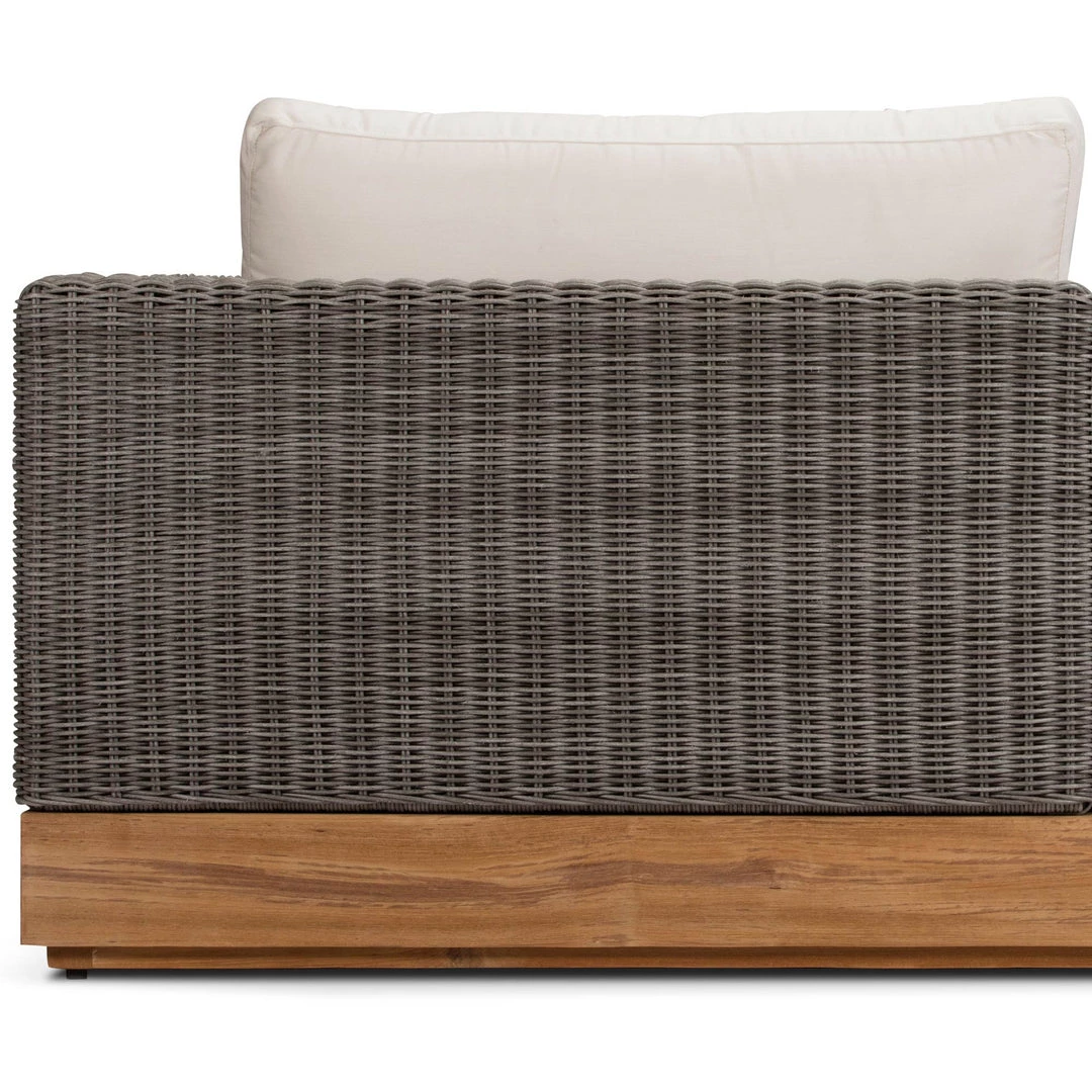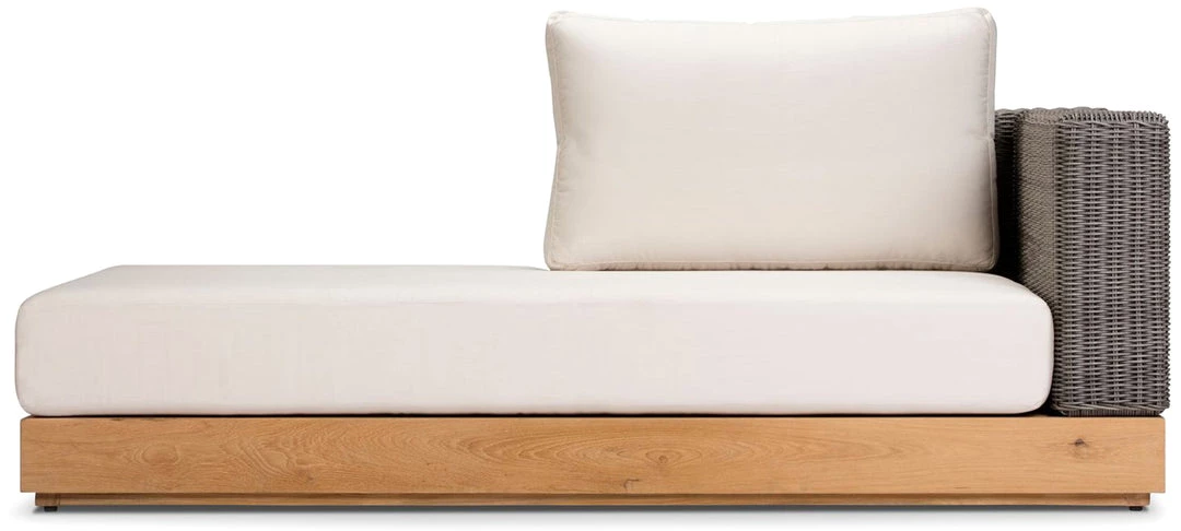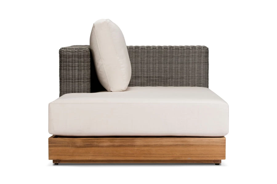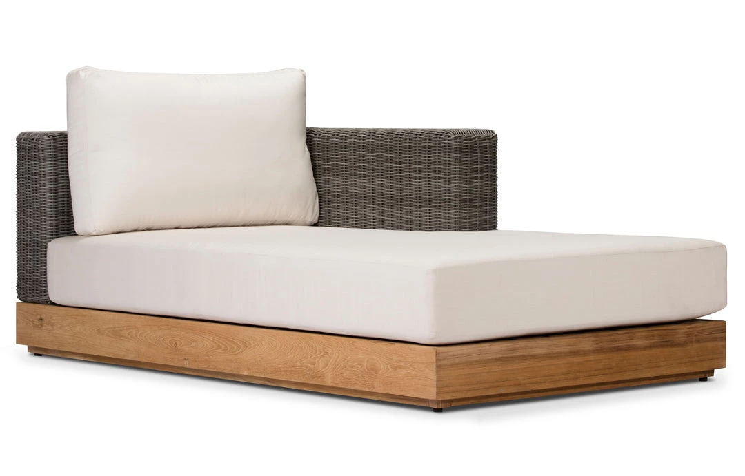 The Malabar Chaise sectional chaise is a modular seating unit for creating unique outdoor sectionals for all day lounging. It has a solid, A-grade Indonesian teak boxed base mixed with All-Weather wicker frame and a Sunbrella upholstered seat cushion. It sports a traditional design re-imagined through modern elements that create a natural and relaxed aesthetic reminiscent of timeless luxury. Offering an imaginative and adaptable modular furniture system ideal for the contemporary lifestyle, The Malabar Chaise takes lounging to the next level.