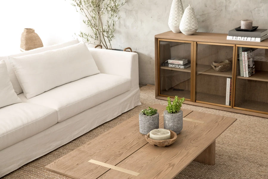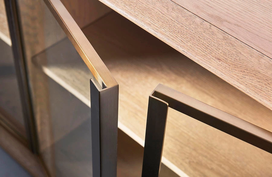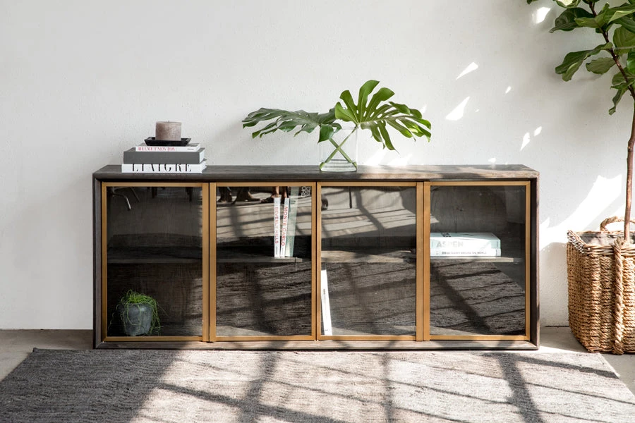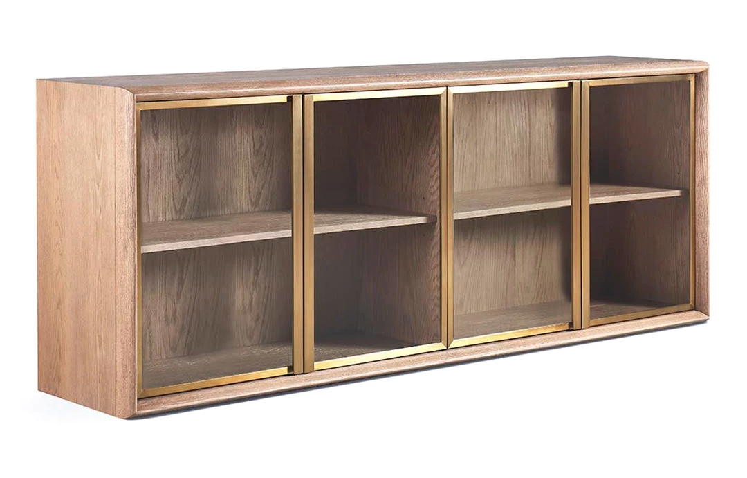 A refined contemporary piece, the Rozelle Media Unit is bold statement piece for the modern living or dining room. The media table features transparent glass doors, a beautifully textured oak top and brass accents. A beautiful highlight to your home, available in natural and dark oak finishes.