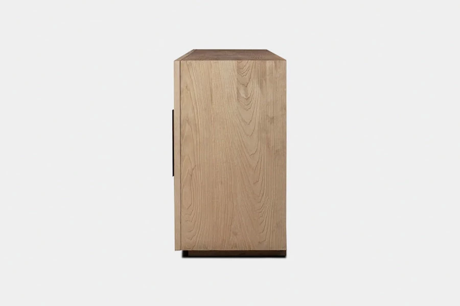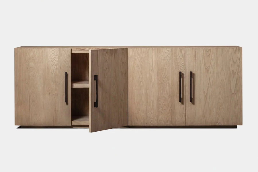 Our Santa Barbara collection mixes refined and straight silhouettes with chunky legs and cut–out detail to create a classic yet cool collection. The Santa Barbara Sideboard Closed is simple by design — featuring a frame of heavily sandblasted solid ash and ash veneers with four doors finished with Harbour–crafted cast brass hardware. Simple craftsmanship puts the material center stage, highlighting the unique grains of the wood in the finishing process. Interior adjustable shelves make this easygoing piece practical for storage.