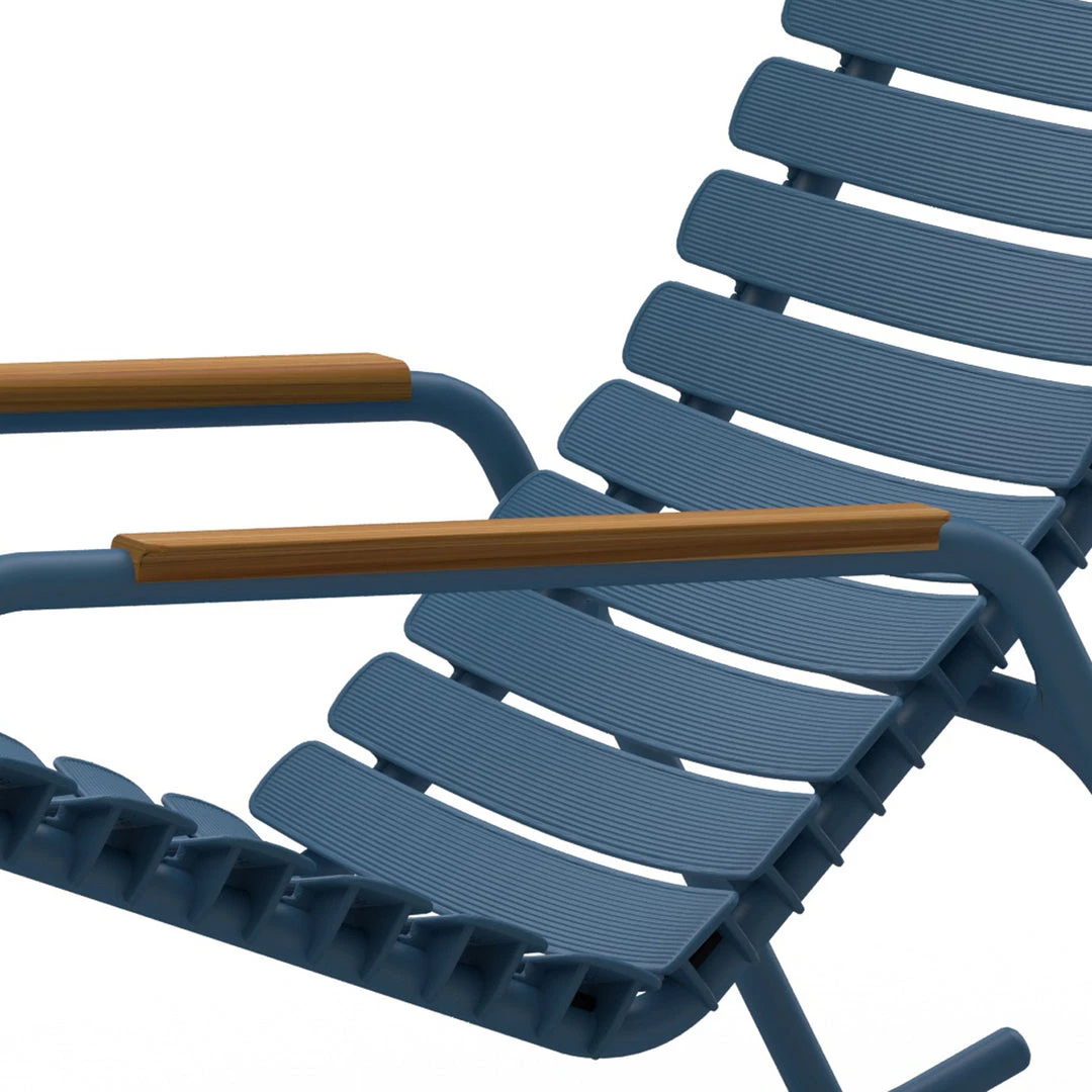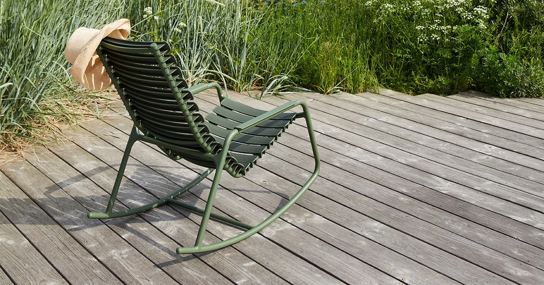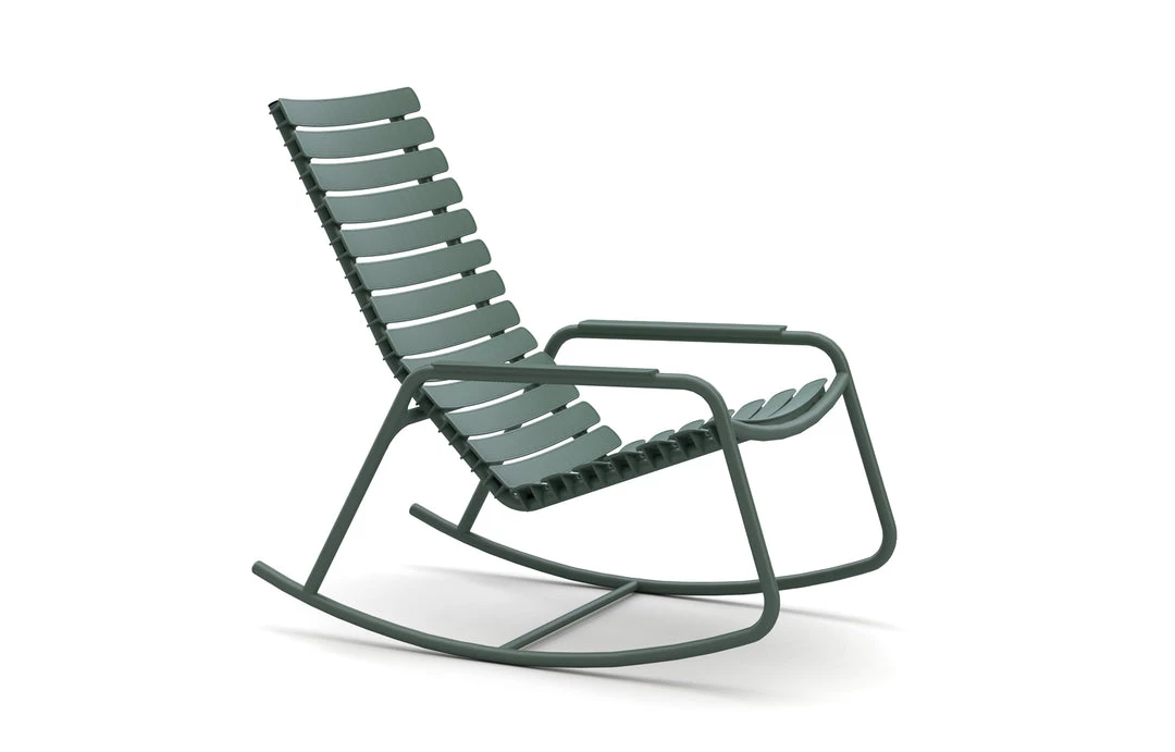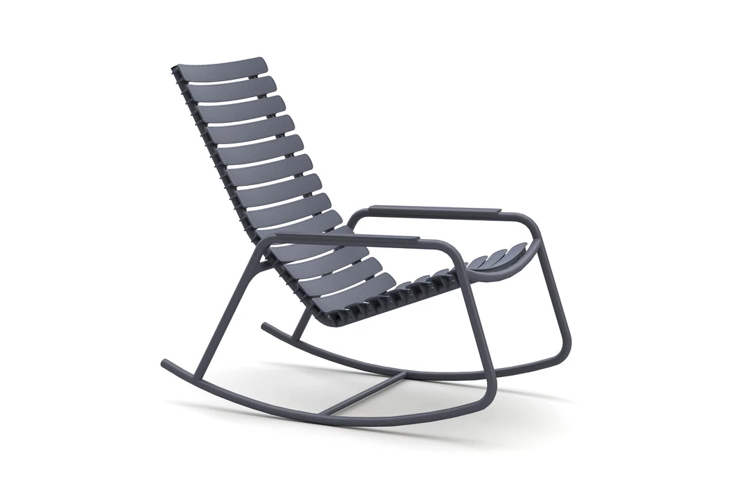 ReCLIPS is a line of chairs with wide plastic lamellas clipped on a light powder coated aluminum frame. The lamellas are made from Danish household plastic trash and produced in Denmark. The technology behind re-using plastic household trash for furniture production is developed in Denmark. So, looking at ReCLIPS you are basically looking at the result of mixing Danish design and Danish innovation in applying new thinking and materials into a chair. ReCLIPS Rocking chair comes in 4 mono colors with the choice of armrests in bamboo or aluminum. The aluminum frame combined with the UV protected plastic lamellas, keep the maintenance to a minimum.