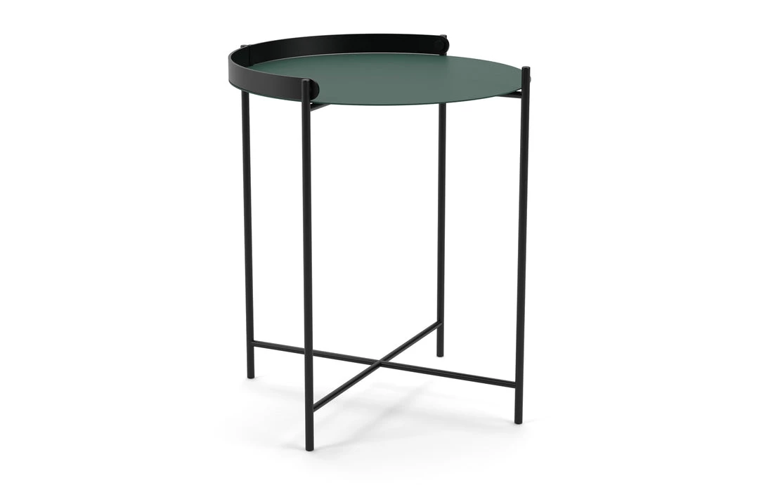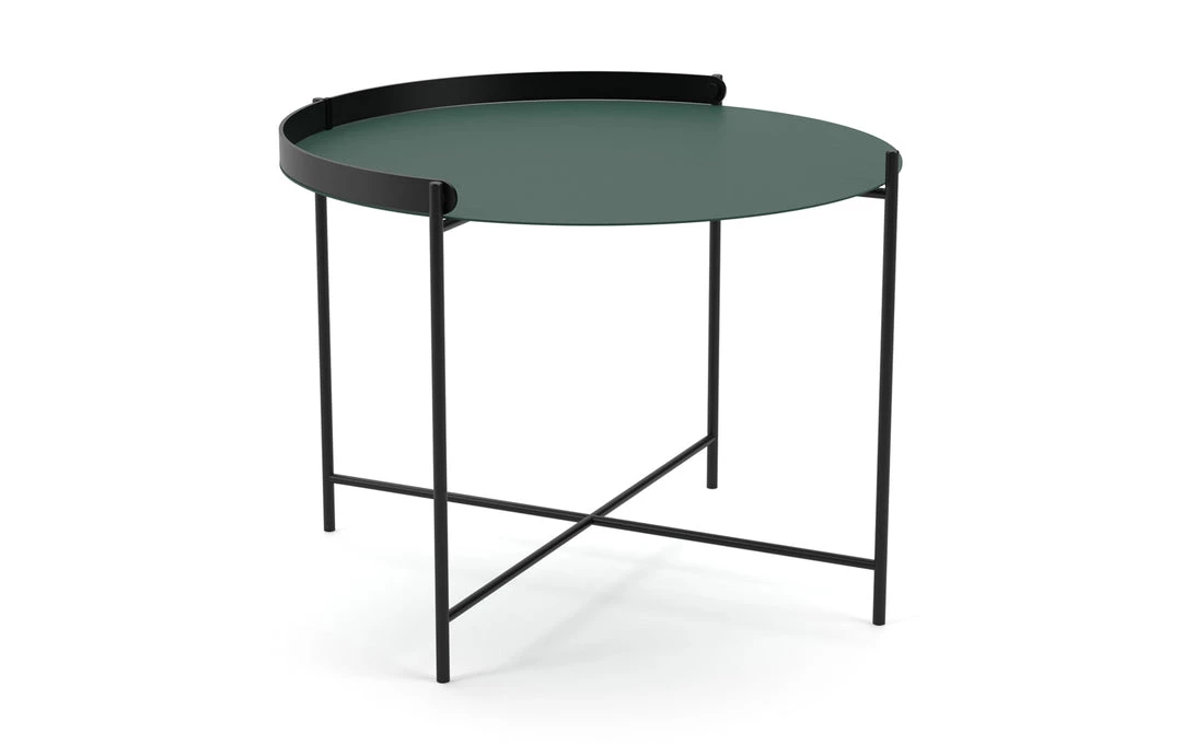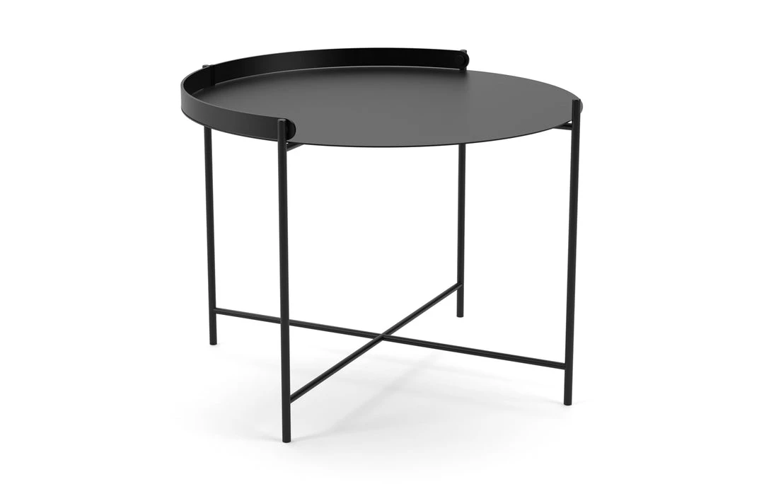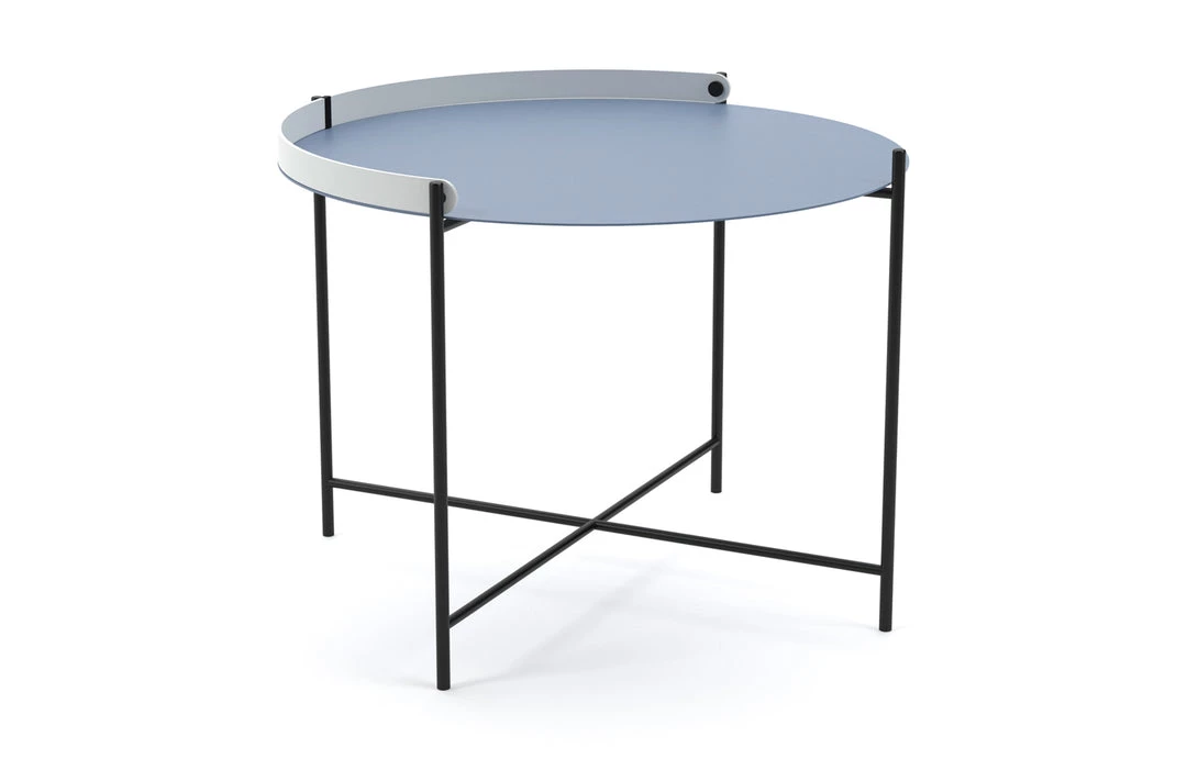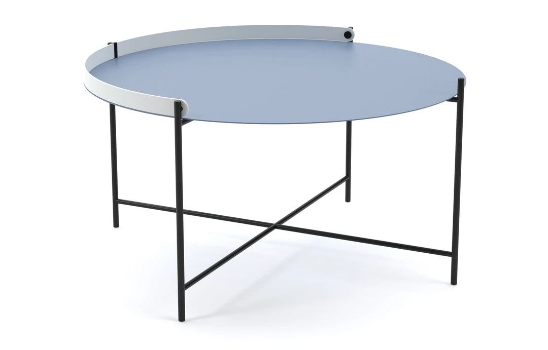 EDGE tray table is suitable for both indoor and outdoor use. The half ring shaped handle makes it easy to move the table between the living room and the garden, and when laid down it functions as a table edge making sure everything stays in place.