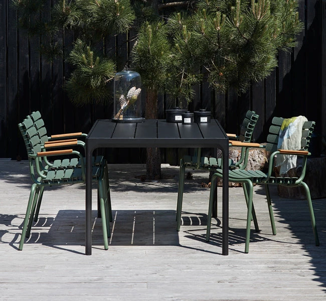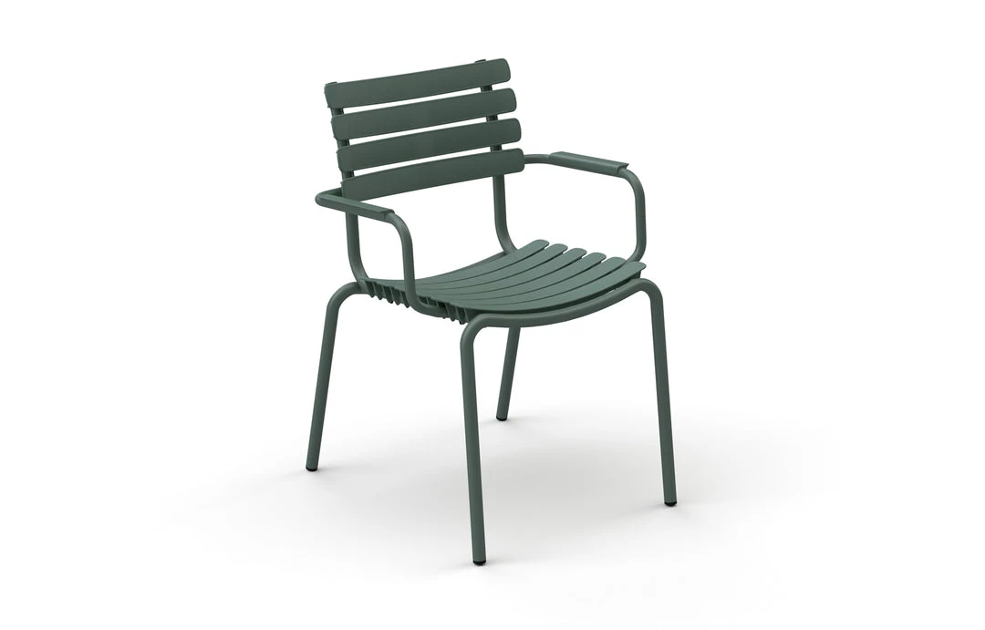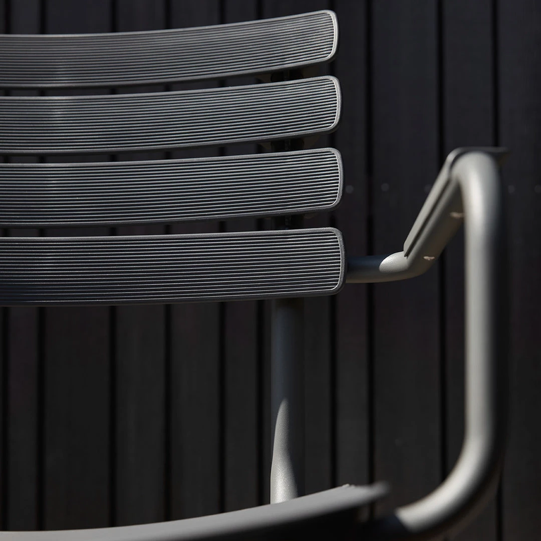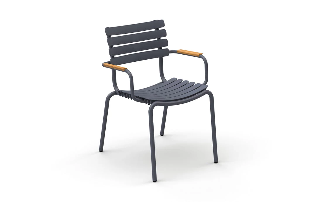 ReCLIPS is a line of chairs with wide plastic lamellas clipped on a light powder coated aluminum frame. The lamellas are made from Danish household plastic trash and produced in Denmark. The technology behind re-using plastic household trash for furniture production is developed in Denmark. With ReCLIPS you are basically looking at the result of mixing Danish design and Danish innovation – and converting this new thinking and materials into a chair. ReCLIPS Dining chair comes in 4 mono colors with the choice of adding armrests in bamboo. The aluminum frame combined with the UV protected plastic lamellas, keep the maintenance to a minimum. ReCLIPS Dining chairs are stackable.