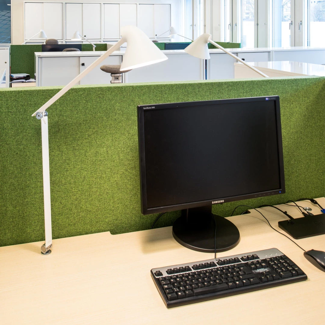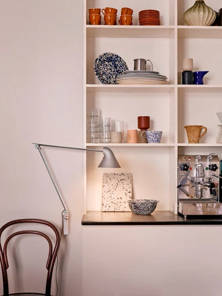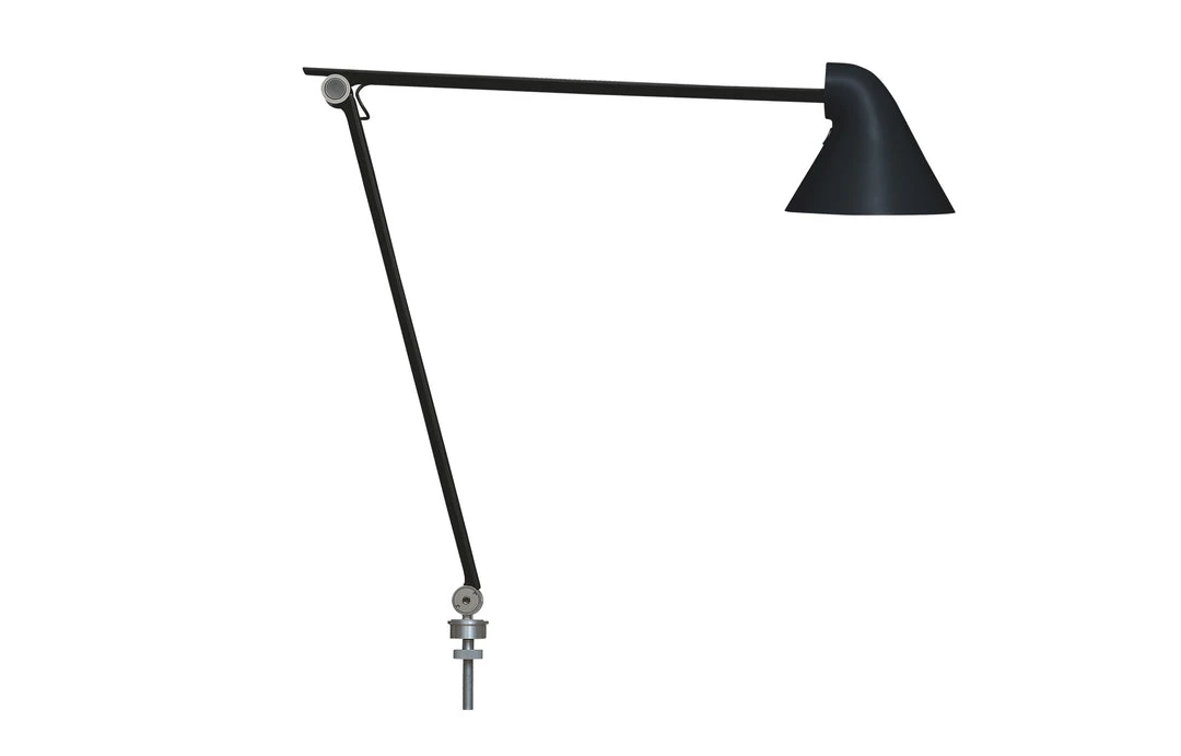 The fixture provides direct glare-free horizontal light while reflecting some of the light through the rear of the head, illuminating the top of the arm. The ergonomic design of the fixture head shapes the light and gives optimal light direction. A simple mechanical system provides great freedom of movement, so the light can always be set in the ideal position in the workspace. The shade is painted white on the inside, reflecting comfortable diffused light.