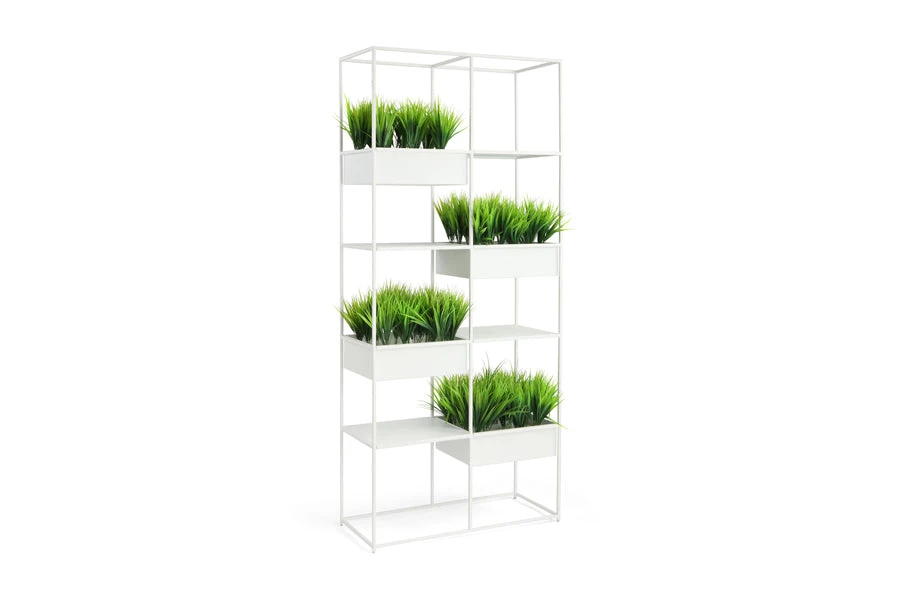 Powdercoated steel frame supports interchangeable shelves and planter bins.