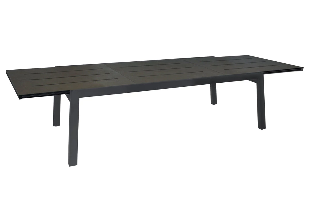 Able to accomodate 12 people more than comfortably, this ‘high pressure laminate’ and powder coated aluminum dining table easily extends from 90.5″ to 141.5″ in a moment.