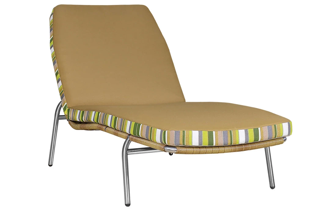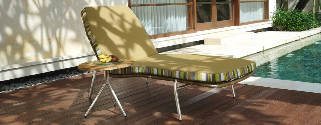 Sturdy stainless steel frame gives this zen lounger a nautical feel. Featuring a QuickDryFoam® cushion with SUNBRELLA cover, and stripe accent on the side.