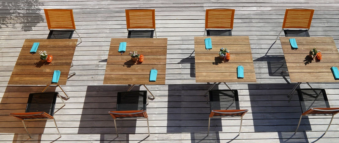 This is the largest square teak topped table in the MAMAGREEN BISTRO range. Self-levelling technology makes it a reliable, practical choice for cafe-style dining.