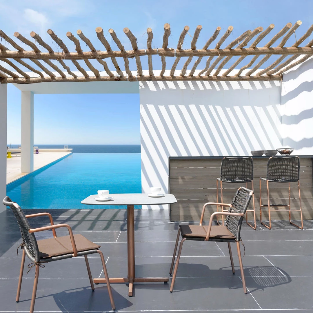 Non-slip frames in powder coated aluminum, these outdoor wicker bar chairs are space efficient, stable and casual looking.
