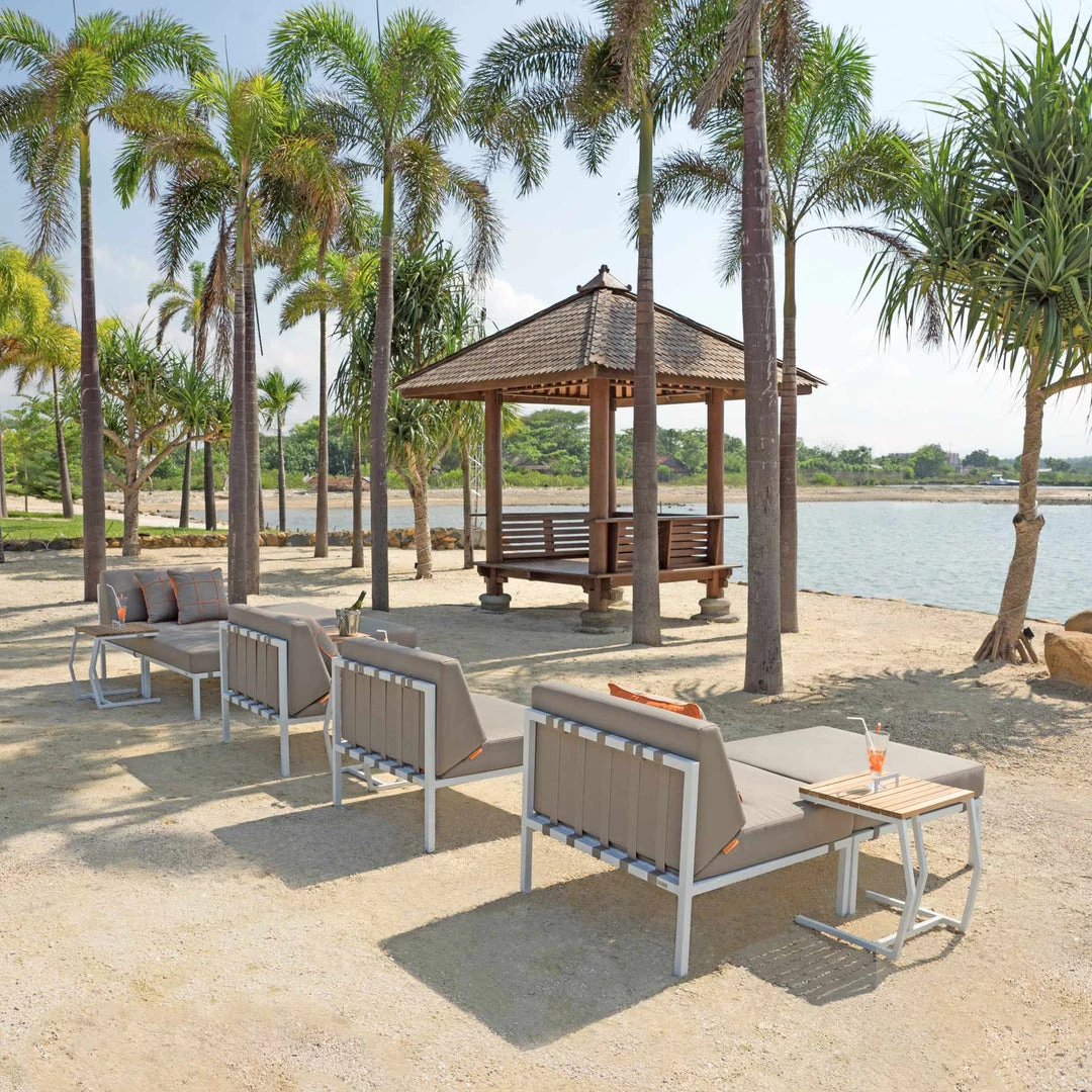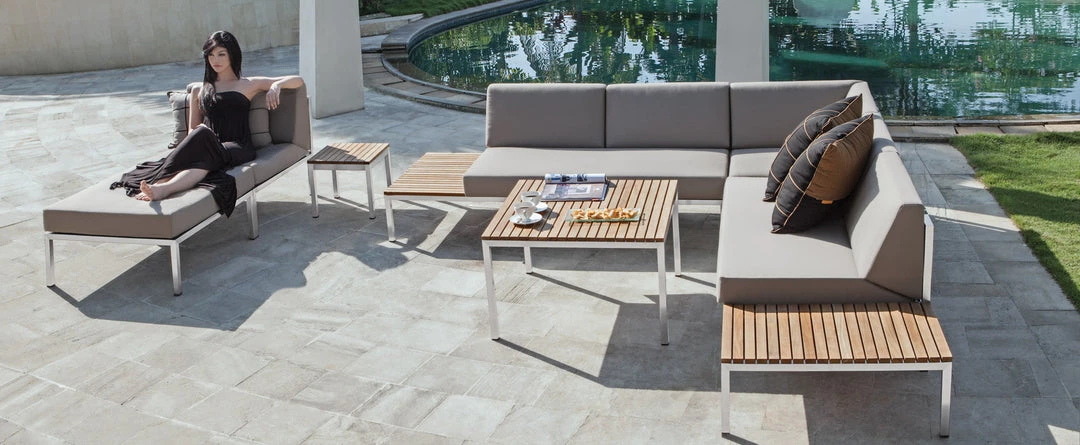 A versatile middle piece. Stainless steel or powder coated aluminum frame with vertical webbing. complete with QuickDryFoam® cushions makes this a highly versatile item. Choose your water repellant Sunbrella® cushion cover color.