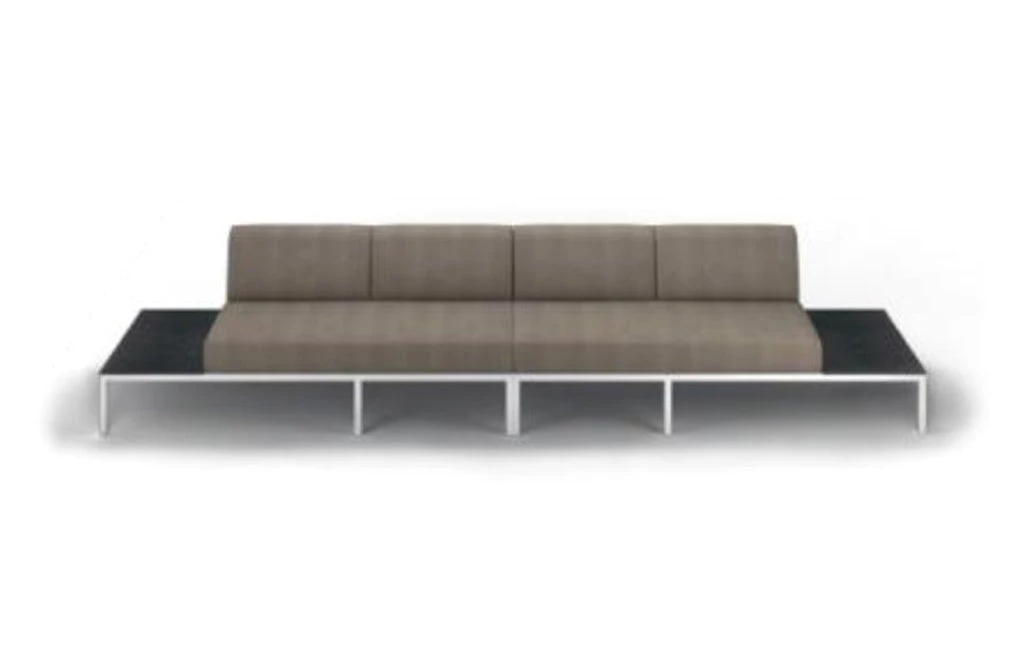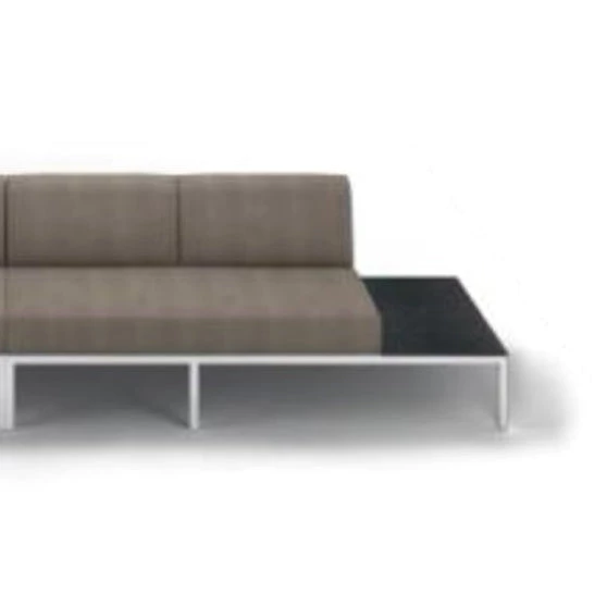 Generous proportions, with a gorgeous built-in teak or ‘high pressure laminate’ side table on the right or left. Stainless steel or powder coated frame with vertical webbing, and standard QuickDryFoam®/Sunbrella® cushions.