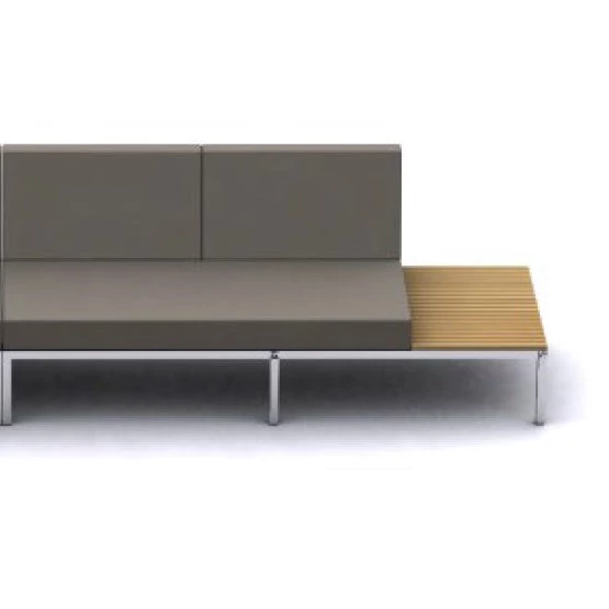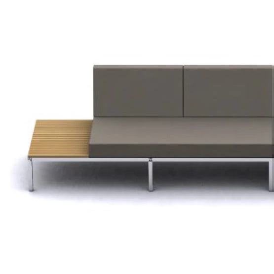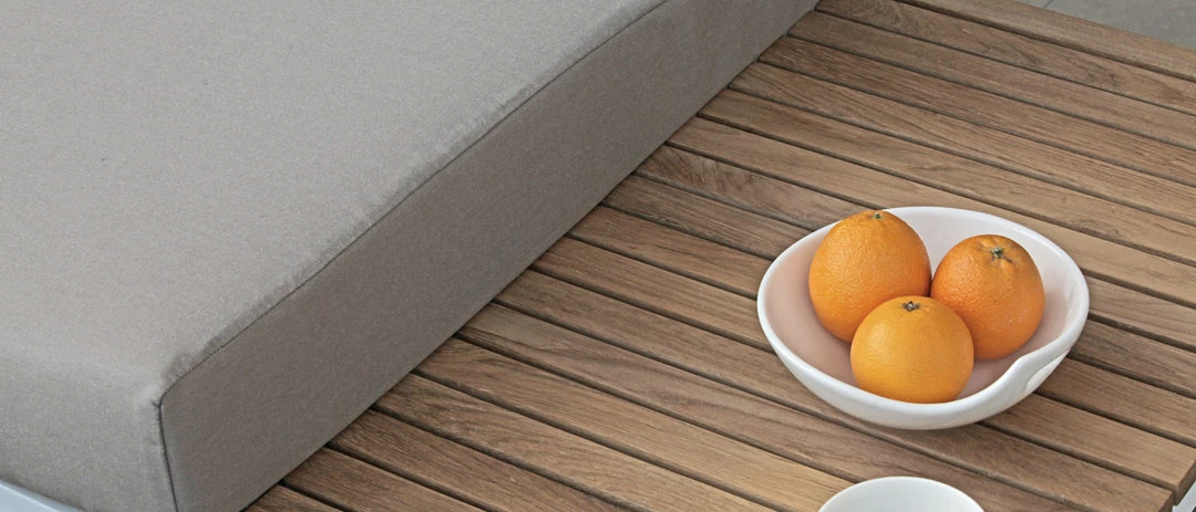 Generous proportions, with a gorgeous built-in teak or ‘high pressure laminate’ side table on the right or left. Stainless steel or powder coated frame with vertical webbing, and standard QuickDryFoam®/Sunbrella® cushions.