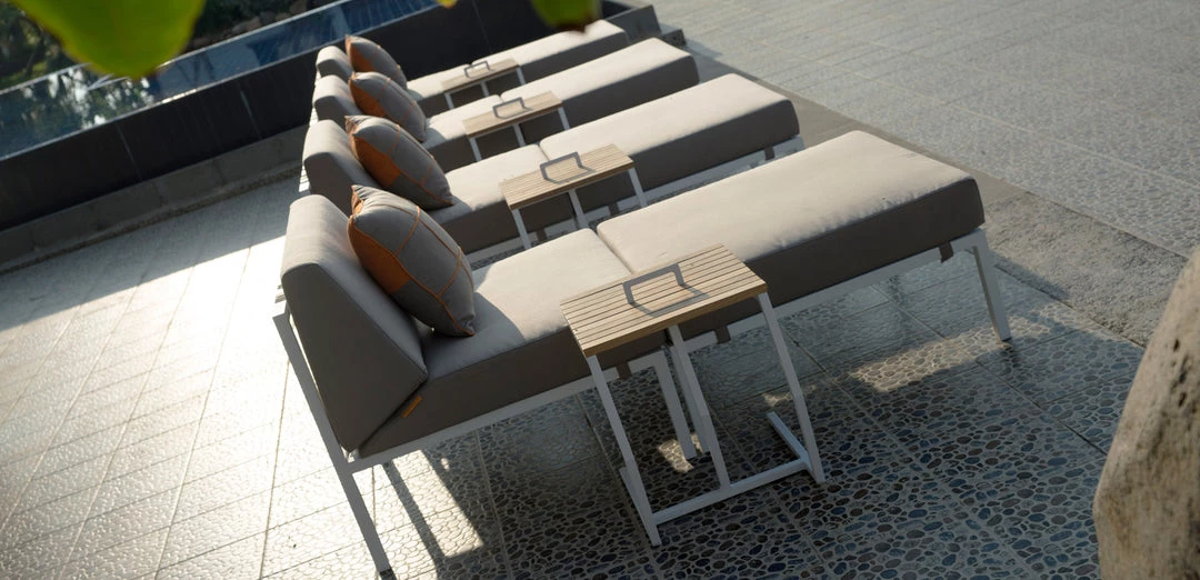 Spectacular design flair meets outstanding quality and outdoor lounging comfort. The key feature of this very special sectional lounge is the Batyline® Keops back detailing. Mounted on a stunning, hairline-finish stainless steel frame, POLLY lounge looks sensational from any angle, and truly remarkable from behind. Choose sectional components, then built-in side table materials, plus cushion style and color for your perfect outdoor lounge. Designed by Vincent Cantaert & Barbara Widiningtias.