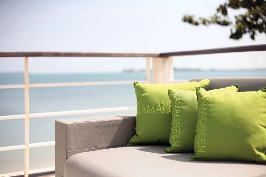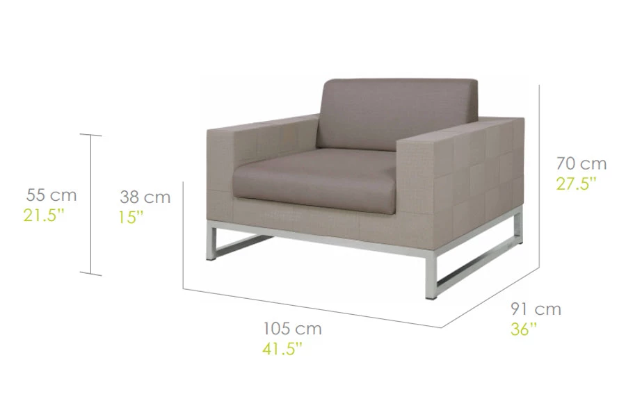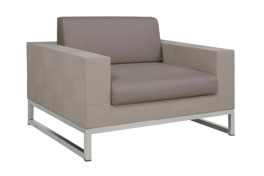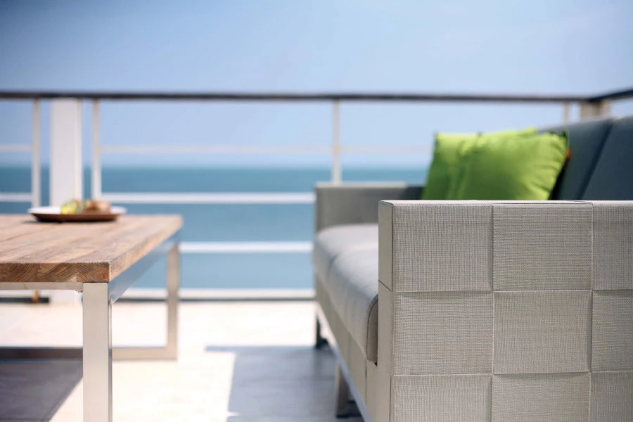 The natural look of strips of Canatex (Batyline fibers mixed with natural hemp), skillfully handwoven in a quilt look pattern, contrasts in harmony with recycled teak and stainless steel. The sofas have cushions in Sunbrella fabric covering a core in Quick-dry foam and strong, waterproof, protective covers are available.