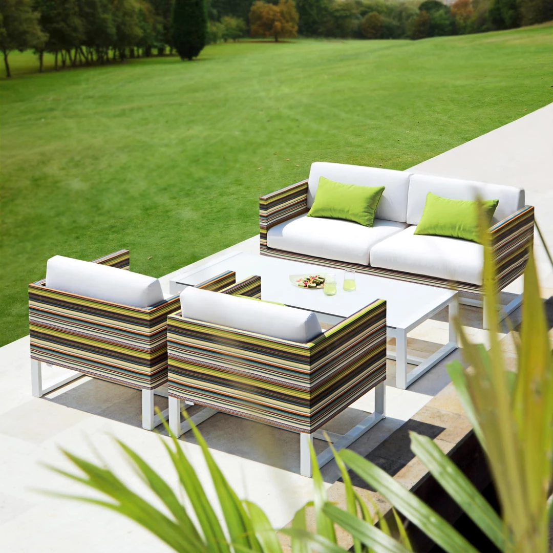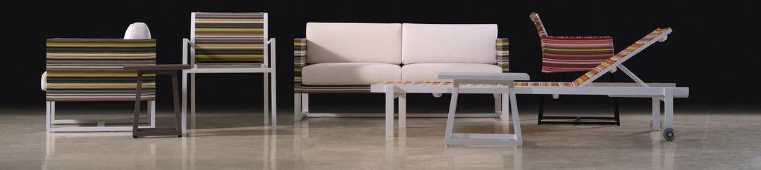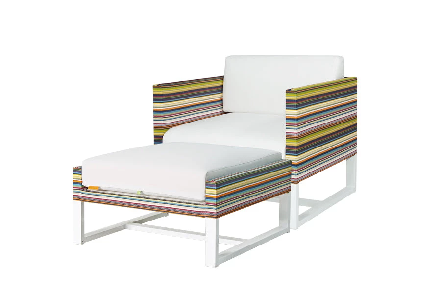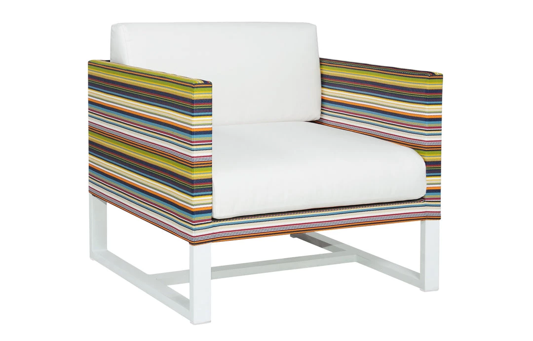 Fun stripe pattern, with cushion and powder coated frame to match. Works back perfectly with the larger sofa pieces or sectional lounge.