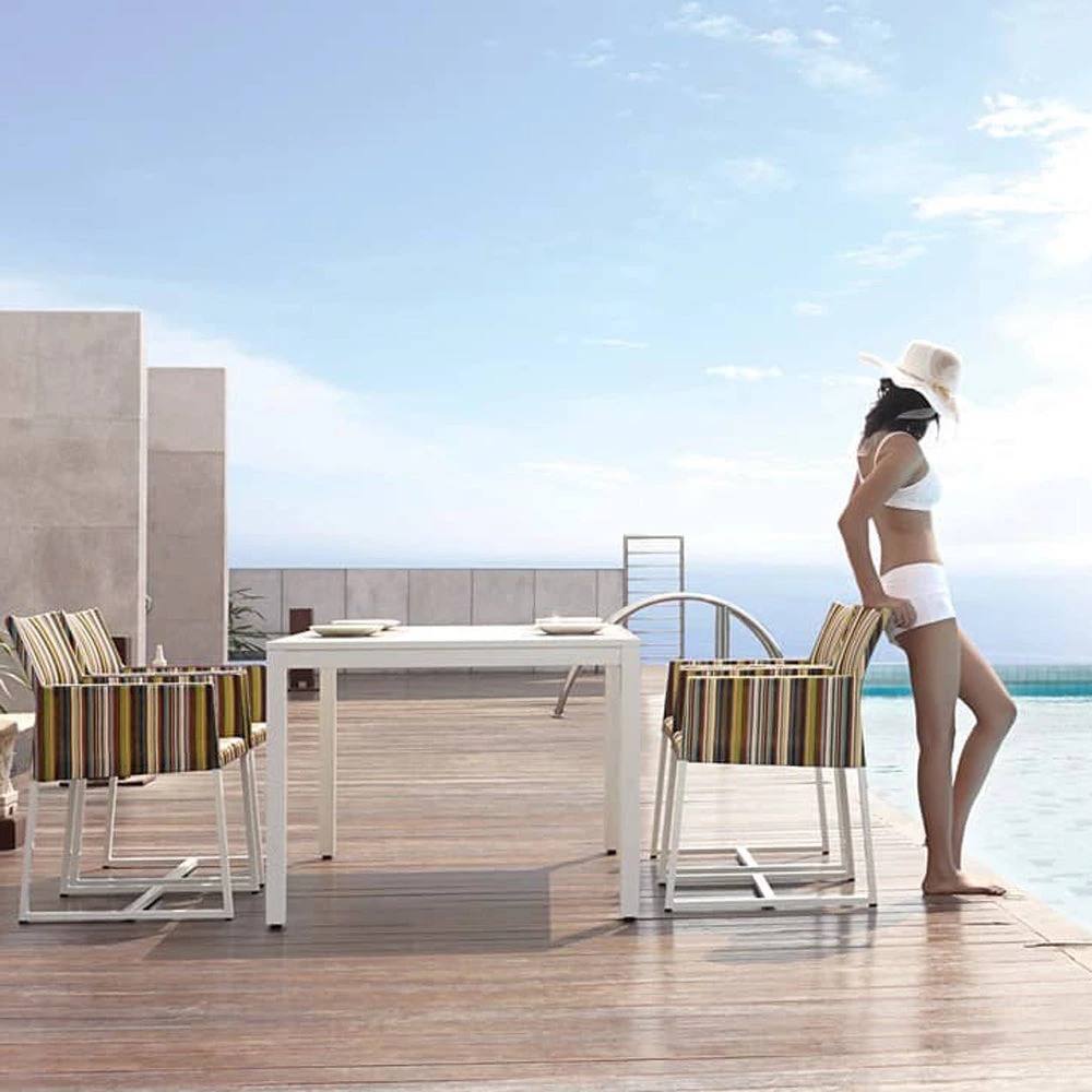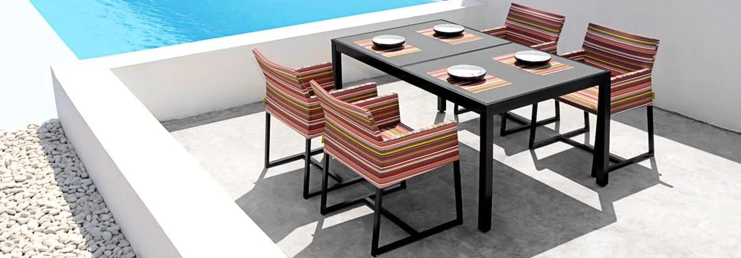 The colorful, body supporting sling covers both arms, and back. Stretched on your choice of aluminum powder coated frame, this is a luxuriously comfortable dining chair.