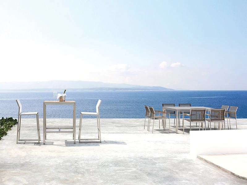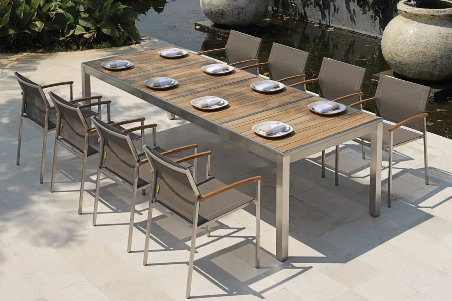 The ultimate in elegant alfresco dining, this stainless steel frame chair uses body-supporting Batyline® sling for extra seating comfort, and teak armrest features.