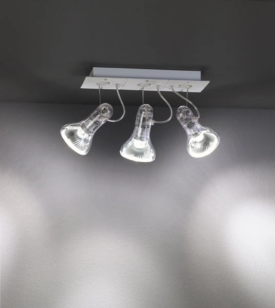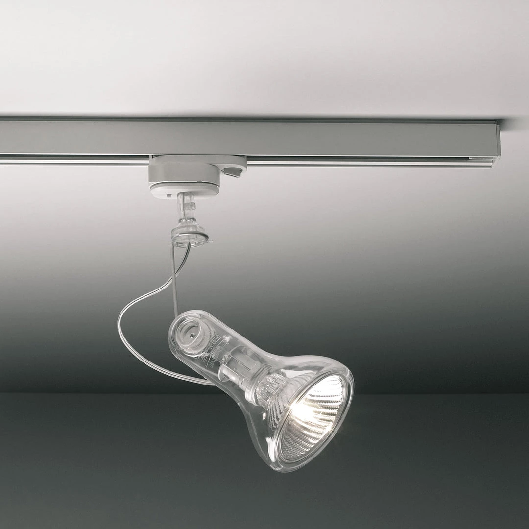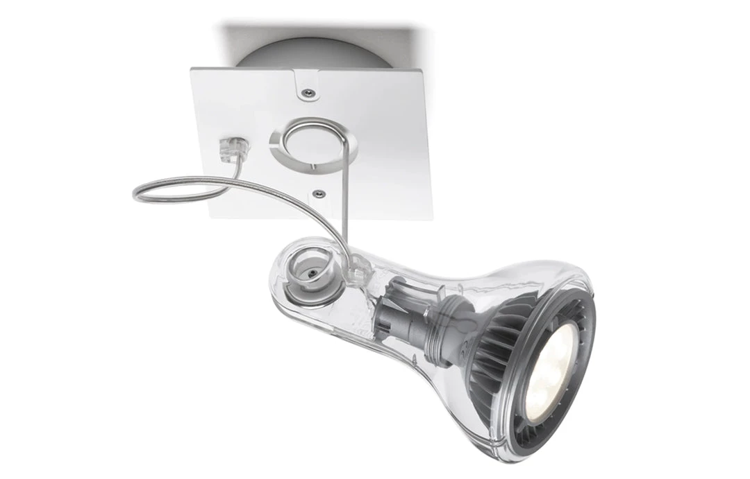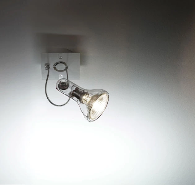 Atlas transforms a common bulb into a spotlight, enveloping it following its outline. Taking its nudity as the starting point, it dresses the bulb up with a transparent suit that also gives the lamp the added benefit of lightness. Made of transparent polycarbonate and a polyamide base, this directional spotlight can be grouped in base of 2 units.