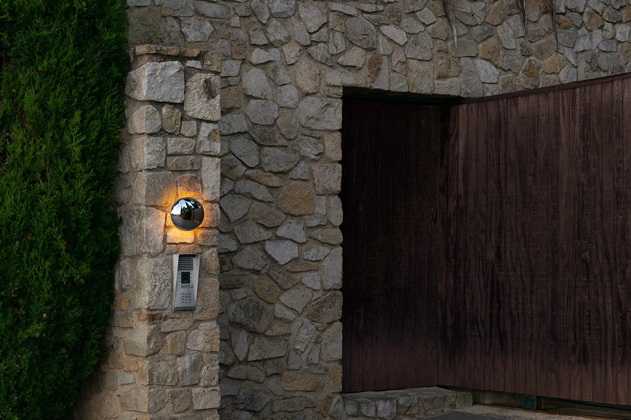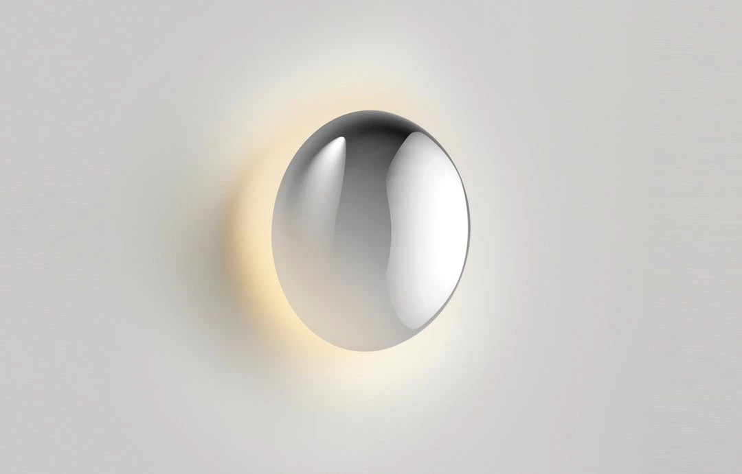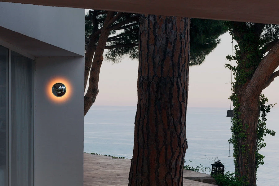 Babila demonstrates that, when it comes to a design, the material can be as important as the shape. This new outdoor wall sconce is of chrome-plated aluminum, with a rounded mirror producing a panoramic effect, reflecting its surroundings. It is not designed to be an architectural element, but rather a simple and beautiful object that draws attention, whether on or off, as it reveals the daily life occurring around it. Babila comes in two sizes, 7 and 11 inches in diameter, and is also available in white or brown varnished aluminum, more discreet versions than the chrome one. In all of them an aura of blurred light is generated, a detail that contrasts with its material. Its lighting is indirect, soft on the wall, and well integrated into outside spaces.