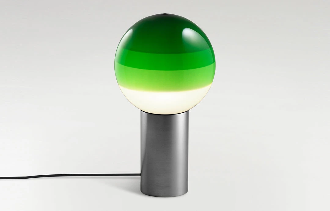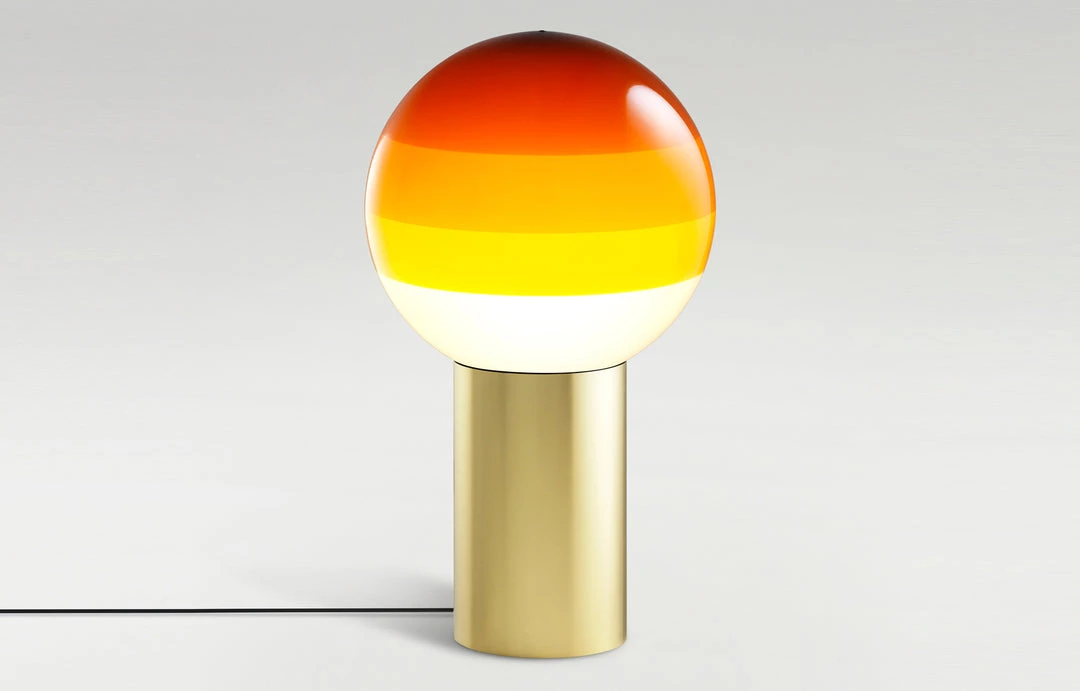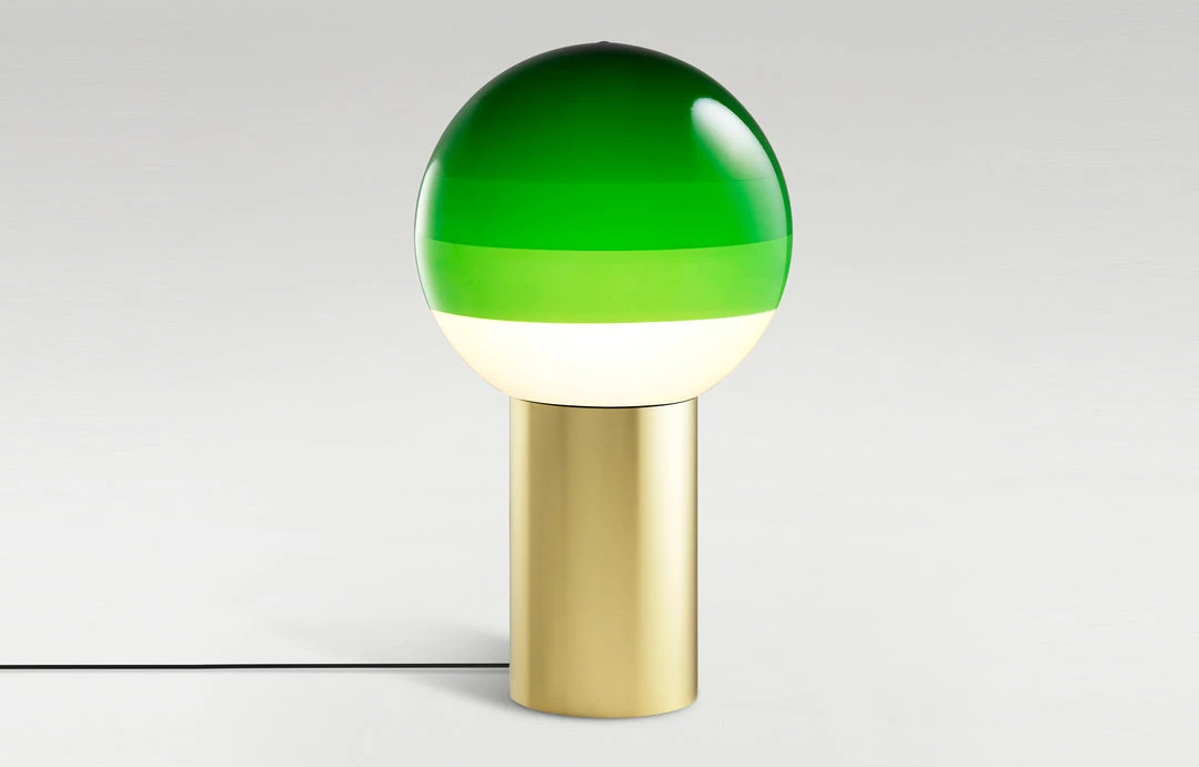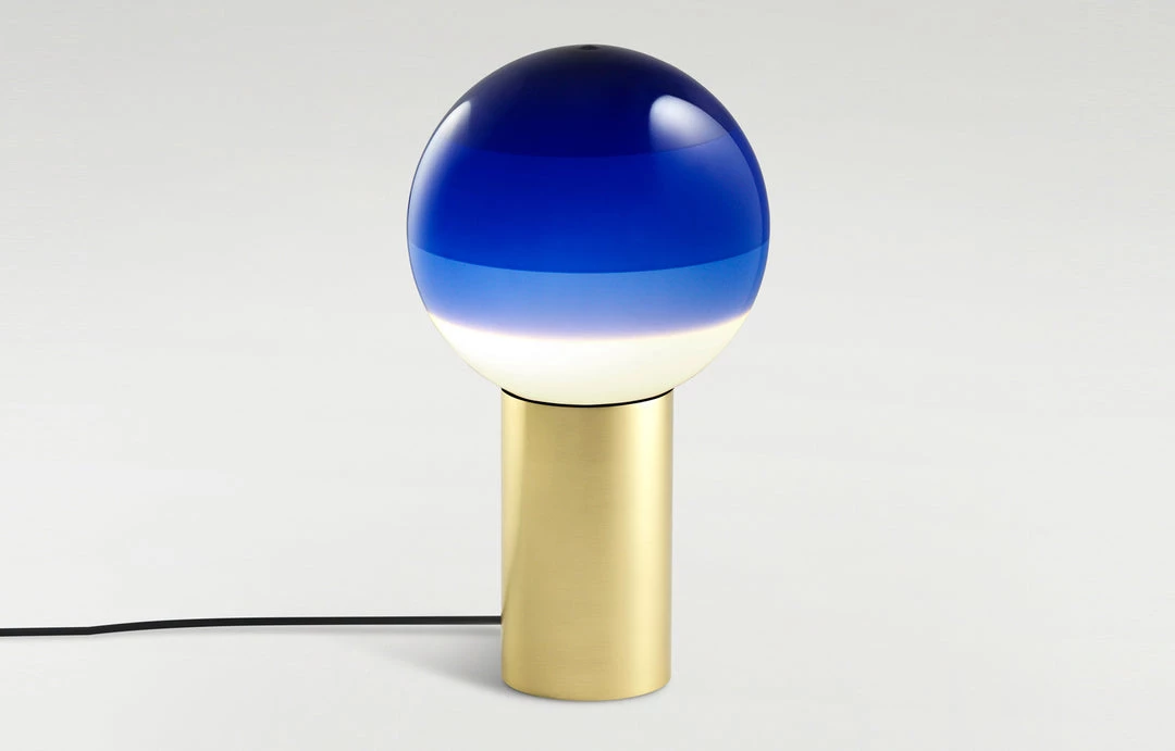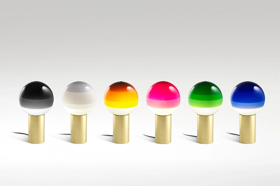 Beyond its function as a lamp, the Dipping Light seeks to excite. When it’s turned on, its different shades of paint sift the light, creating a magical ambient effect. When it’s off, its colored glass sphere is an object charged with beauty, and eye-catching design piece for a shelf, bedside, or table. The Dipping Light was created as yet another experiment – dipping a lit bulb into paint several times – with the end result of this table lamp. The various layers of paint draw concentric circles and capture the light, moderating its intensity. The paint becomes the shade, coloring, and texturing the light. A brass or graphite base is added for support. This artisanal process will make each lamp a unique and exclusive creation.
