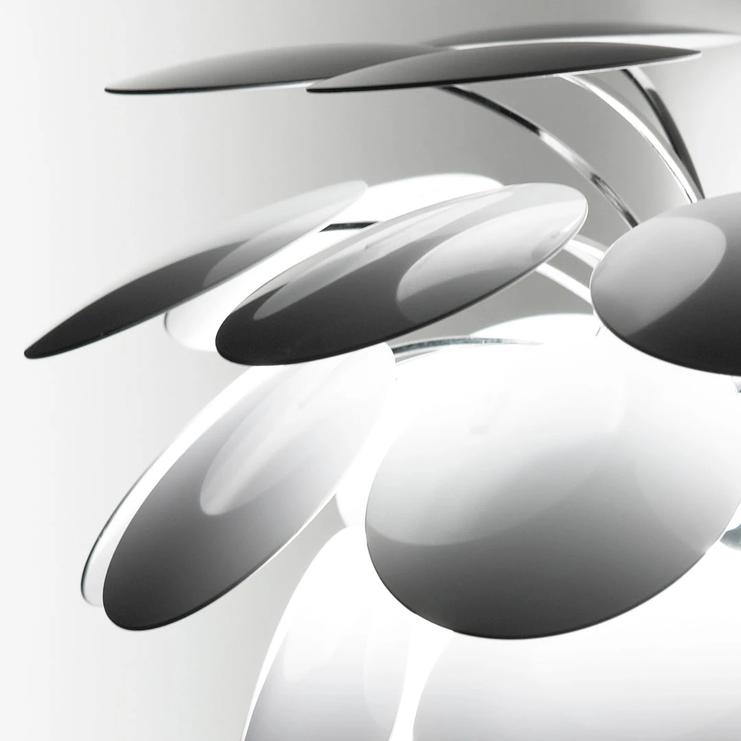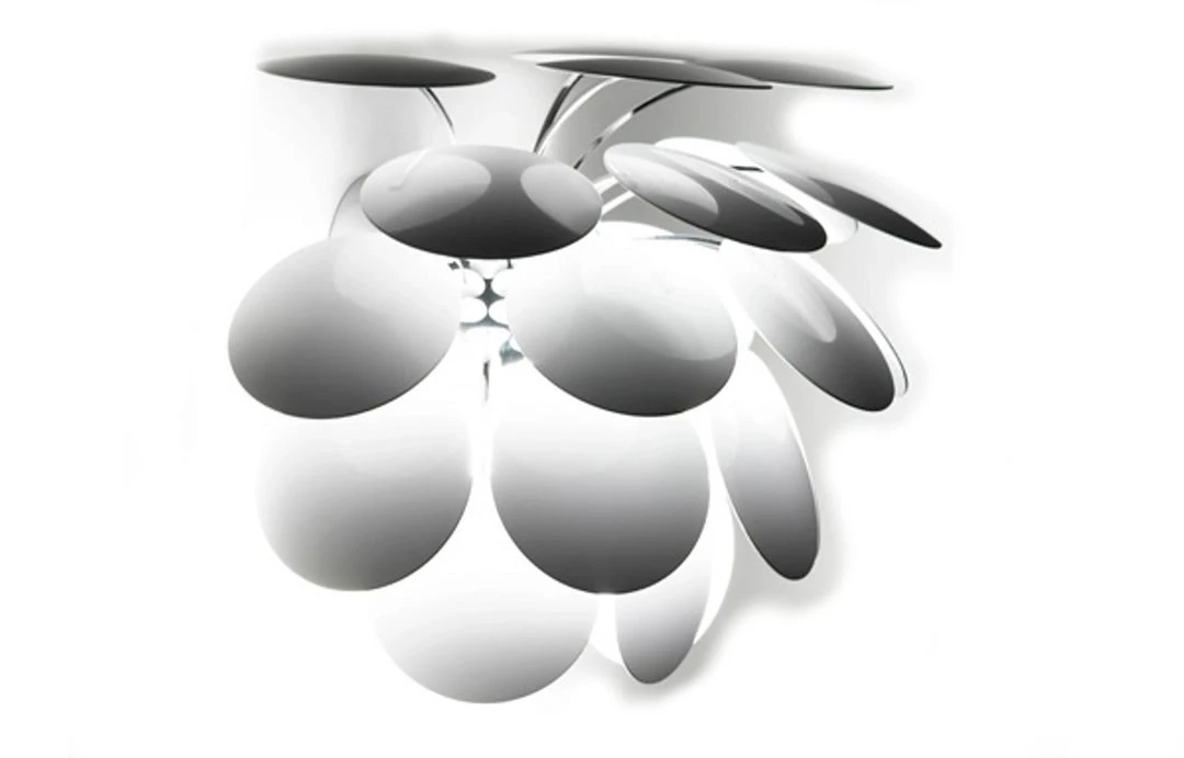 This lamp consists in a series of white lacquered disks that float around a chromed semi sphere. These disks act as layers that shield the light source, at the same time redirecting and reflecting the light onto the underlying disks. All of this combined results in a distinct and unique light which fills and enriches space.