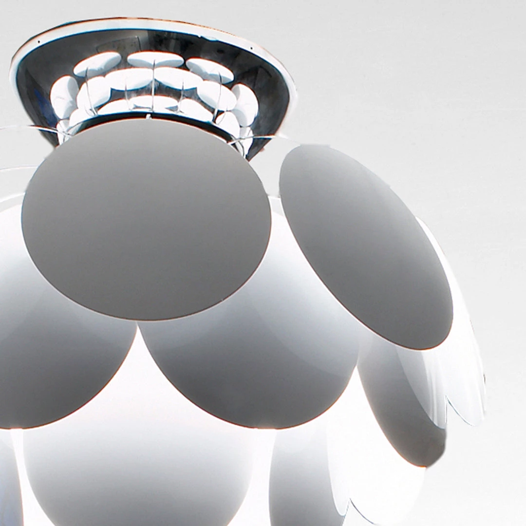 This lamp consists in a series of white lacquered disks that float around a chromed semi sphere. These disks act as layers that shield the light source, at the same time redirecting and reflecting the light onto the underlying disks. All of this combined results in a distinct and unique light which fills and enriches space.