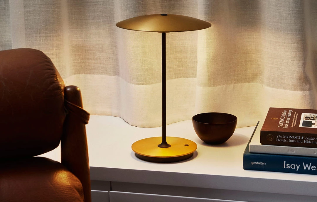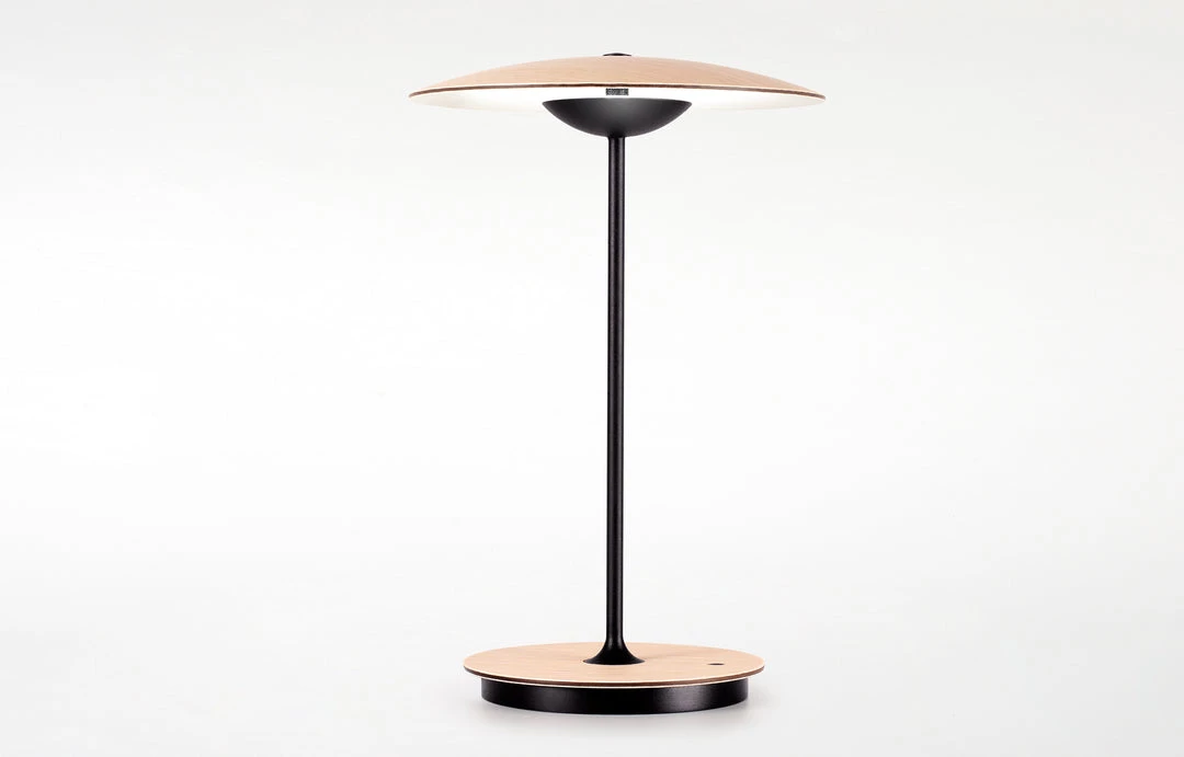 Wood is a great ally of cozy lighting. It is a material that is hard to mold, a challenge that the Ginger collection neatly resolves. The combination of sheets of wood, paper and resins pressed together under high pressure achieves a laminate that appears almost entirely flat, which discreetly lights up spaces with indirect light. The Ginger collection has been expanded over time to provide solutions to different lighting needs, and is available in pendant, table, wall, and floor lamp versions. This year, we are adding a new, smaller suspension lamp, a portable table lamp, another version of wall lamp with a movable arm, and three different sizes of flush-mount wall lamps. The latter boast extraordinary structural simplicity, and can be combined with each other to great effect. Thanks to a rechargeable lithium-ion battery, the new portable table version of Ginger allows spaces to be lit independently with utter freedom, and with no need for wires.