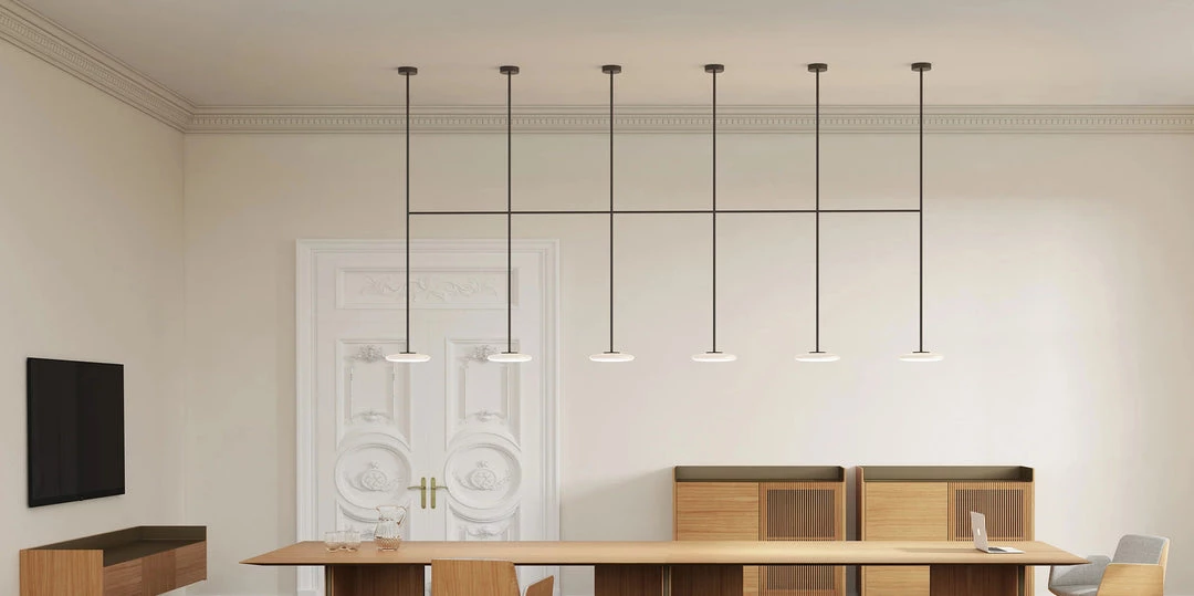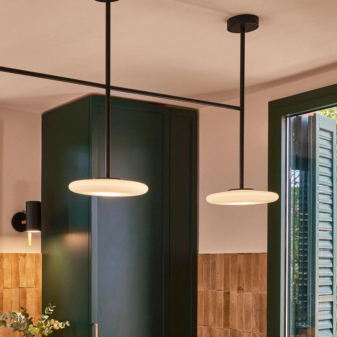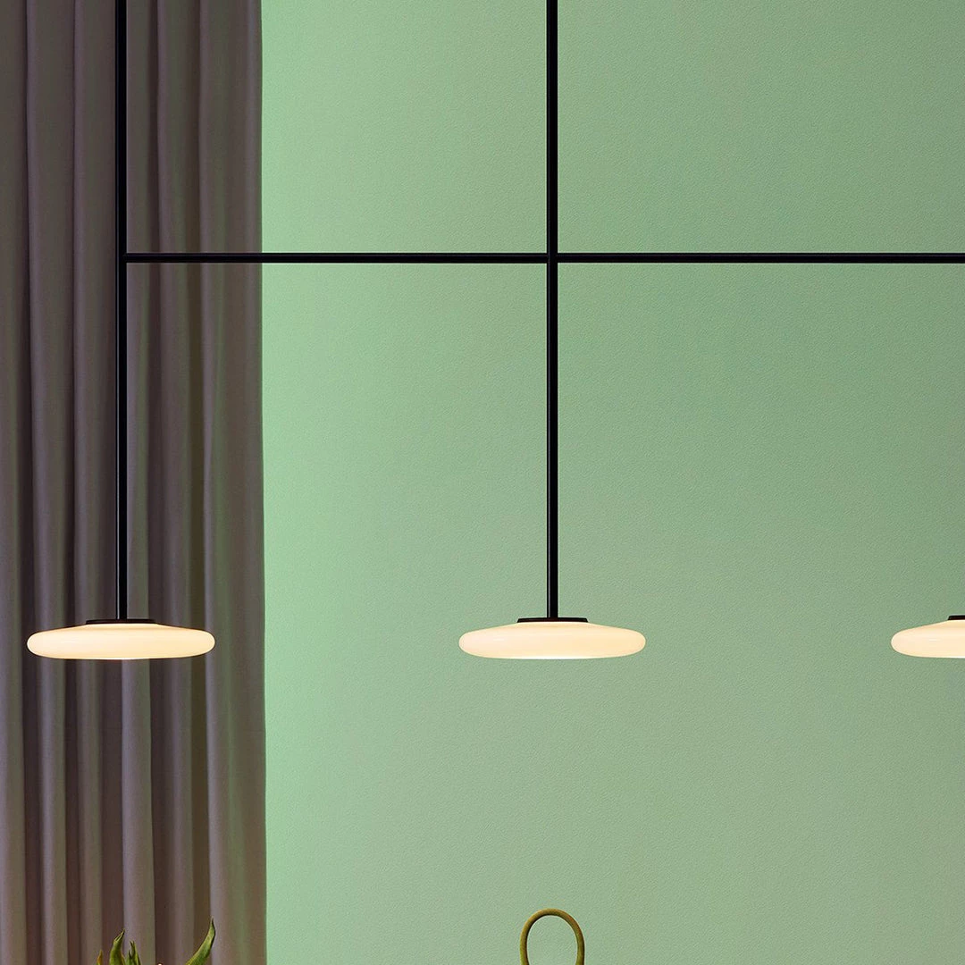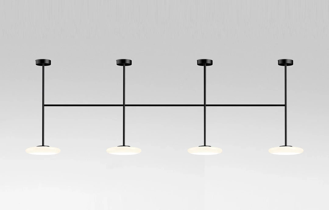The serene shapes of the Ihana trace out a silhouette of light. This lighting system consists of several opal blown glass diffusers that are pleasing to the eye, appear ductile and contrast with the firmness of the metal structure that determines its shape and fastens it to the ceiling. In an effort to offer ambient light for any classic or contemporary interior design project, this collection can be used to create light compositions. This is made possible by its structure, which can be extended to include 14 diffusers, connected to a single point of light. It is available in different sizes to illuminate spaces with high ceilings as well. In addition, the Ihana features dim to warm technology, which allows not only regulating the intensity of the light, but also its color temperature, which can vary from a warm white (3000K) to an ultra warm white, simulating candle light (1800K). Often, a design is born of necessity. Ihana, which means “exquisite” in Finnish, is one of them. Its creator, the architect Joanna Laajisto, moved her studio to a 19th century building in Helsinki and couldn’t find any lamps that fit in with her new office. In search of the beauty of light, she created a sculptural lamp defined by its pure, almost graphic forms, and by the balance between rigidity and fragility. Ihana is a synthesis of contrasts that combines contrasting colors, the black metallic structure and white diffusers, and nuances of old and new. A contemporary and timeless design made by its creator to endure over time and become part of those stories in which no one remembers what year it was designed. A lighting system that consists of several opal blown glass diffusers that are integrated to the firmness of the metal structure that determines its shape.