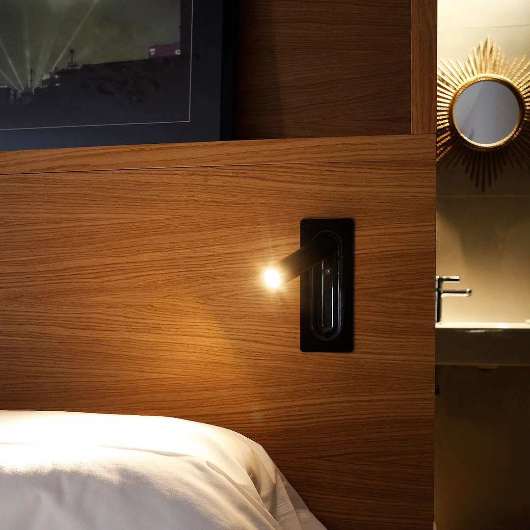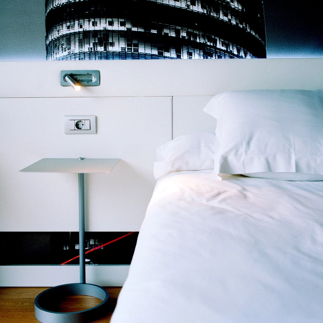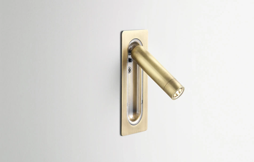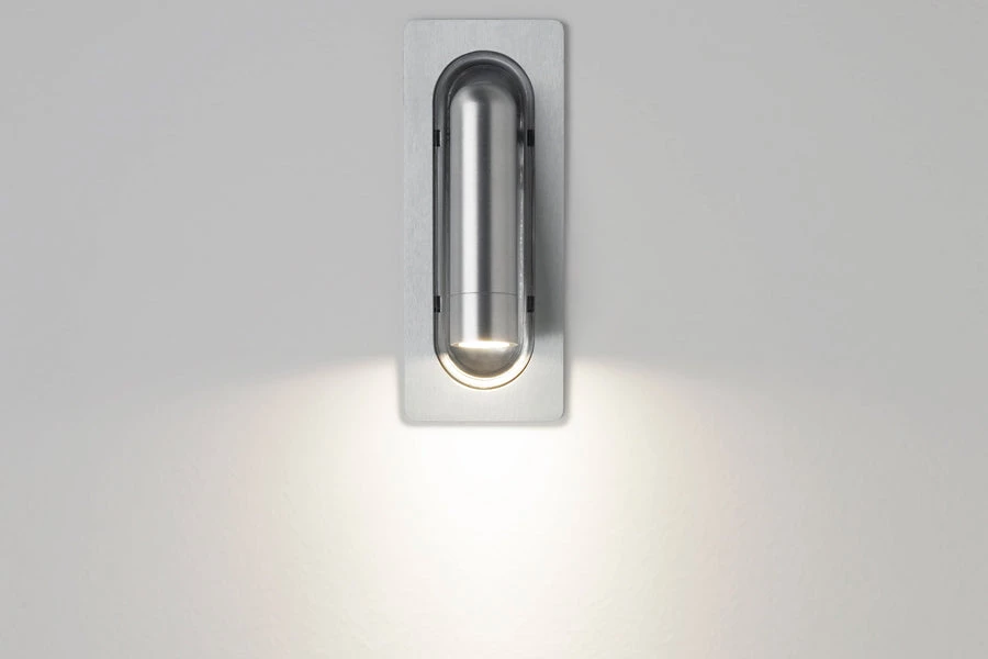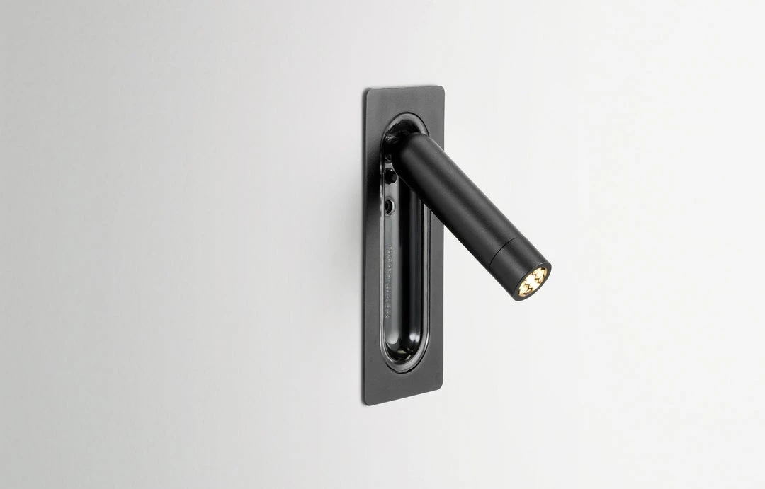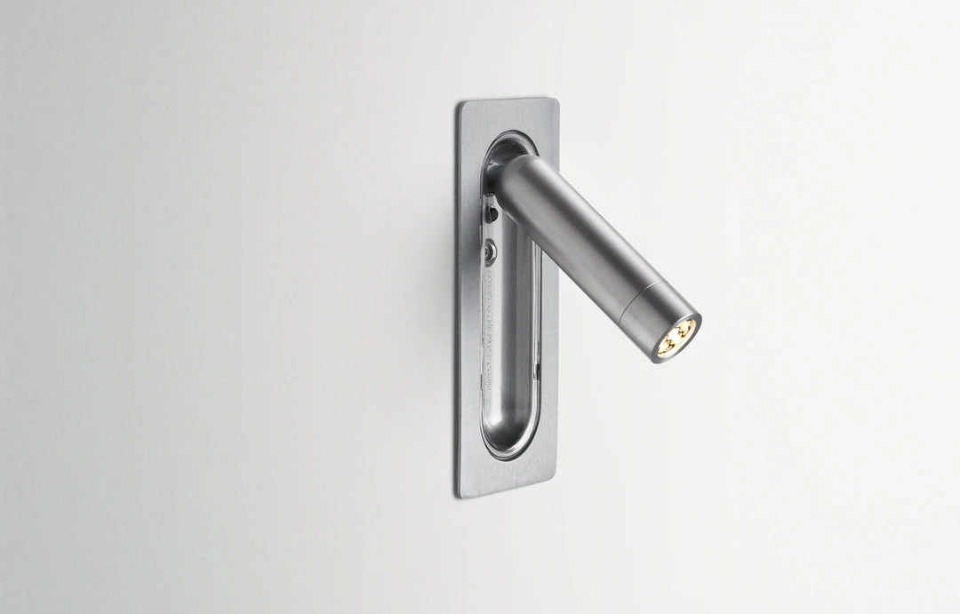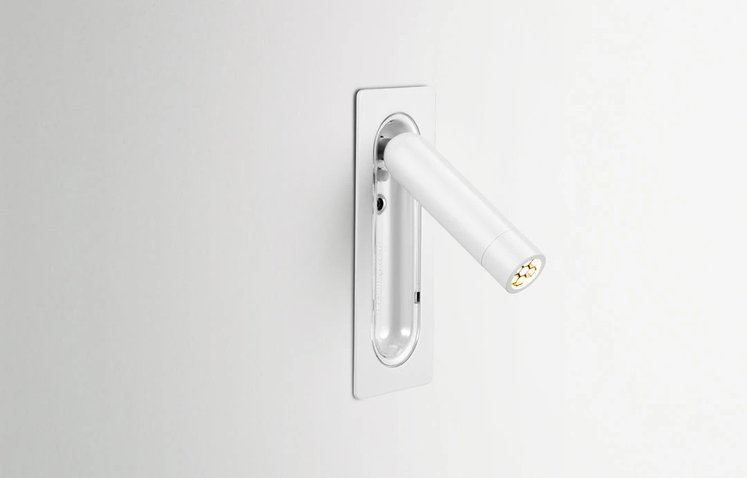 Ledtube is an orientable wall lamp which incorporates 3W 2700ºK LED technology and a 24º lens that direct a sharp beam of light. It combines plan and cylindrical shapes made of injected aluminum and a frontal part made of transparent polycarbonate. Due to its architectural and functional design, Ledtube can be installed vertically or horizontally and it is suitable as a built-in bedside lamp.