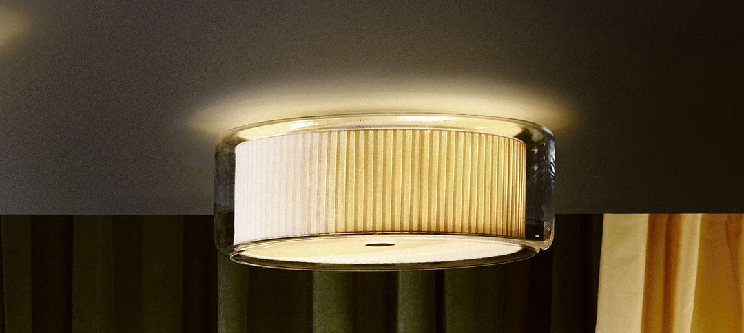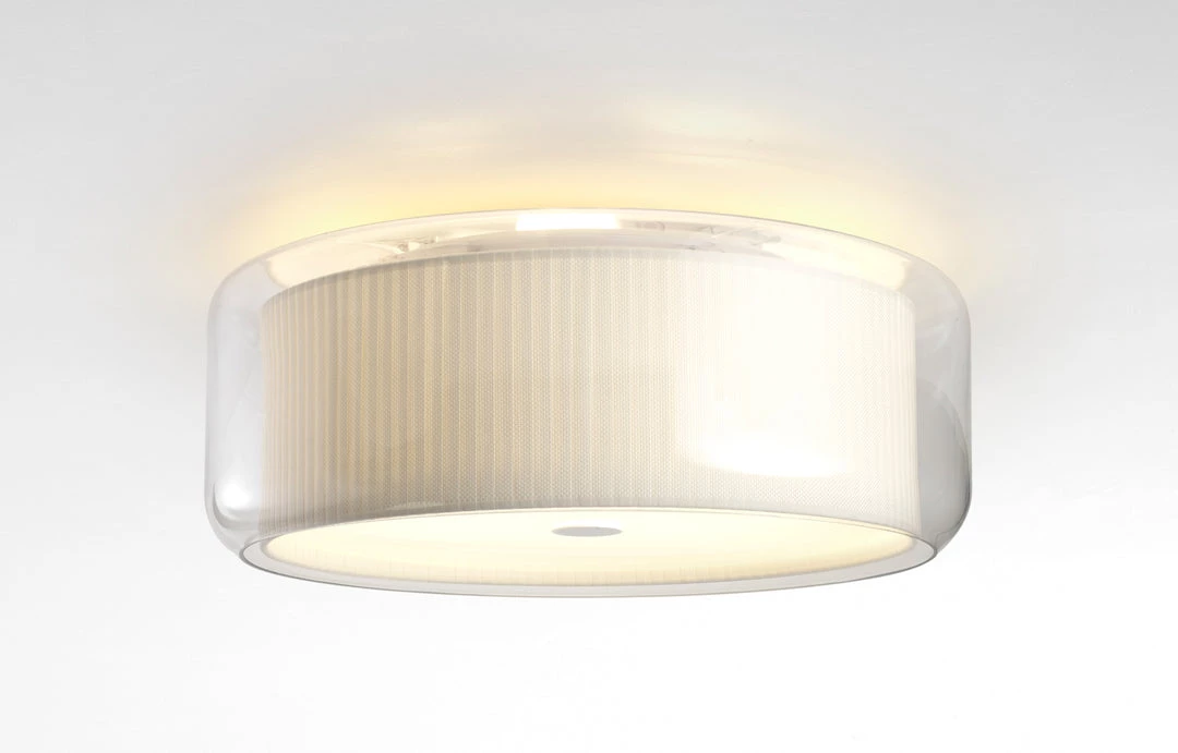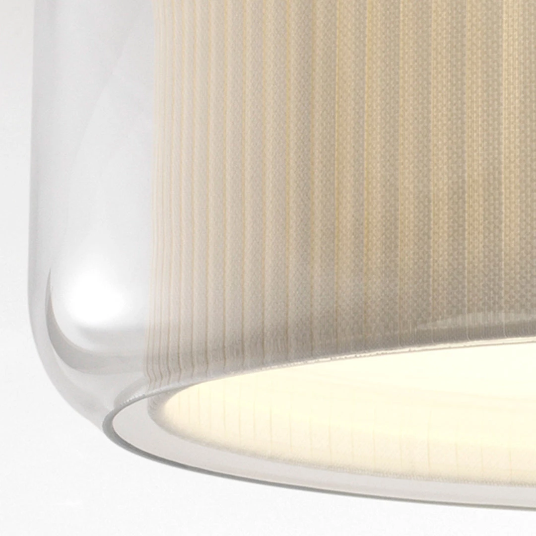 The ceiling version of the Mercer lamp joins this range of lighting fixtures that stand out for their subtle reversal of roles: the cloth shade is inside a structure of transparent blown glass. The glass delicately protects the shade in warm pleated cotton or in a sophisticated black fabric, at the same time as producing additional reflections.