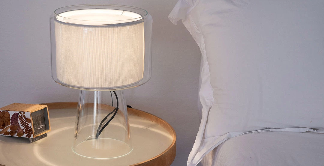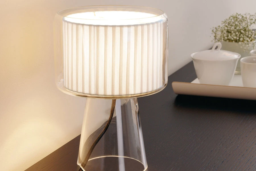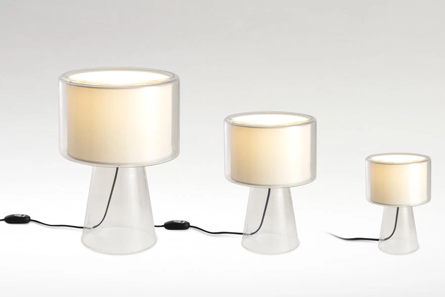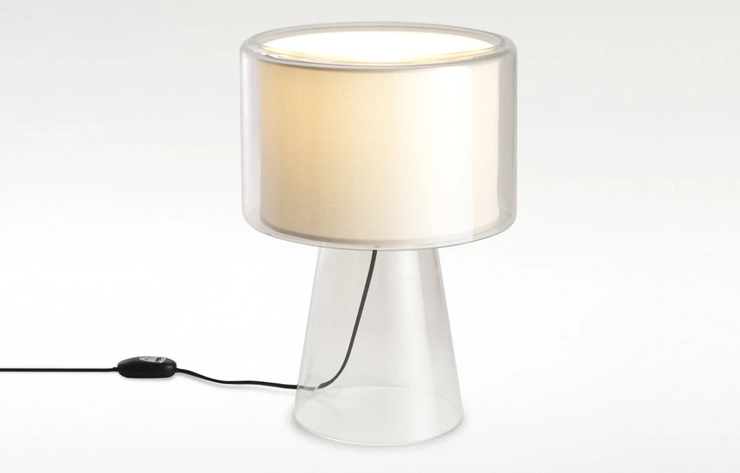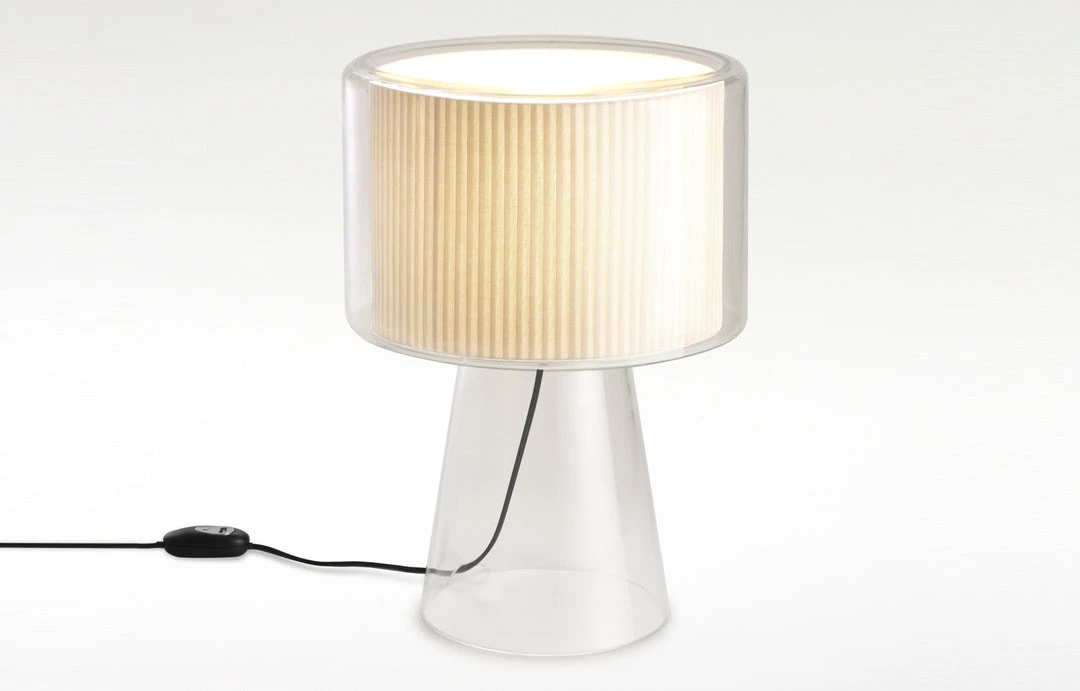 Mercer is a beautiful and elegant lamp. The fusion of different materials achieves a spectacular result due to its pure cotton ribboned shade floating in a transparent blown glass structure. This lamp is available in two versions: in the first, the natural cotton color of the ribboned shade produces a direct and diffused light; and the second, a more sober design, has a black ribboned cotton shade, which is more sophisticated and sends out light directly through the top and bottom.