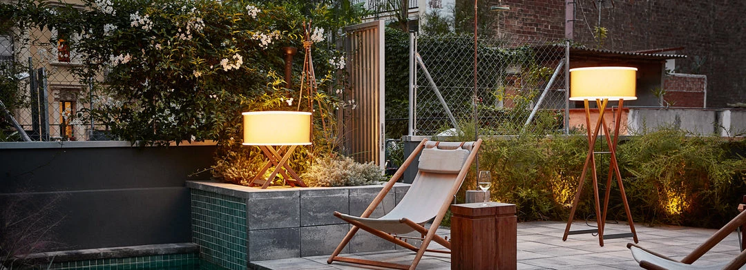 Creating a warm, comfortable indoor atmosphere in an outdoor space. This is the aim of Cala, a highly decorative light with a structure which draws on the simplicity of metal café tables or the classic painter’s trestle. The rotary moulded polyethylene shade is enclosed in a zipped Textilene sleeve which filters the light and gives it a texture rich in nuances. IP65 rated, it is available in suspension and floor version.