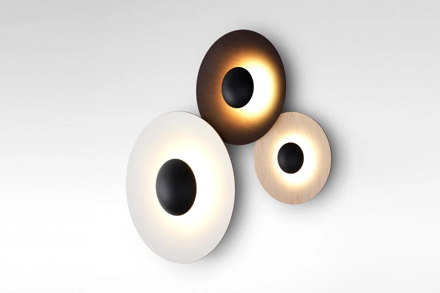 Wood is a great ally of cozy lighting. It is a material that is hard to mold, a challenge that the LED-Ginger collection neatly resolves. The combination of sheets of wood, paper and resins pressed together under high pressure achieves a laminate that appears almost entirely flat, which discreetly lights up spaces with indirect light. The LED-Ginger collection was born of wood, that great ally of cozy lighting. Sheets of wood, paper, and resins, compacted at high pressure, yielded a warm and intimate lamp. The LED-Ginger’s sleek, understated appearance and robust reflected light made it an immediate favorite. With the introduction of new metal shades, in black, white, or brushed brass finish, the Ginger offers the same warm, glare-free light to help emphasize your spaces. These metal shades offer a more refined option that is almost sculptural in its appearance. The extensive LED-Ginger collection numerous sizes of pendant, table (including the portable version), floor, and wall lamps, as well as a flush-mount version that can combined together in clusters of 2 to 3 fixtures, connected via an accessory to a single outlet box. In addition to white, the interior of the diffuser is available in oak, wenge and brushed brass finishes, yielding different hues of light. The LED-Ginger is an aesthetic, almost artistic design that offers a great visual effect in any finish.