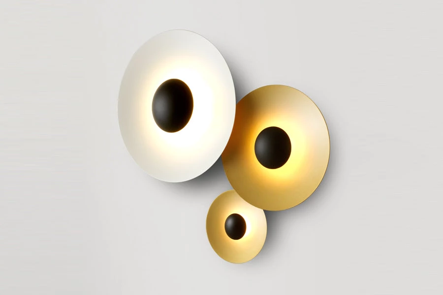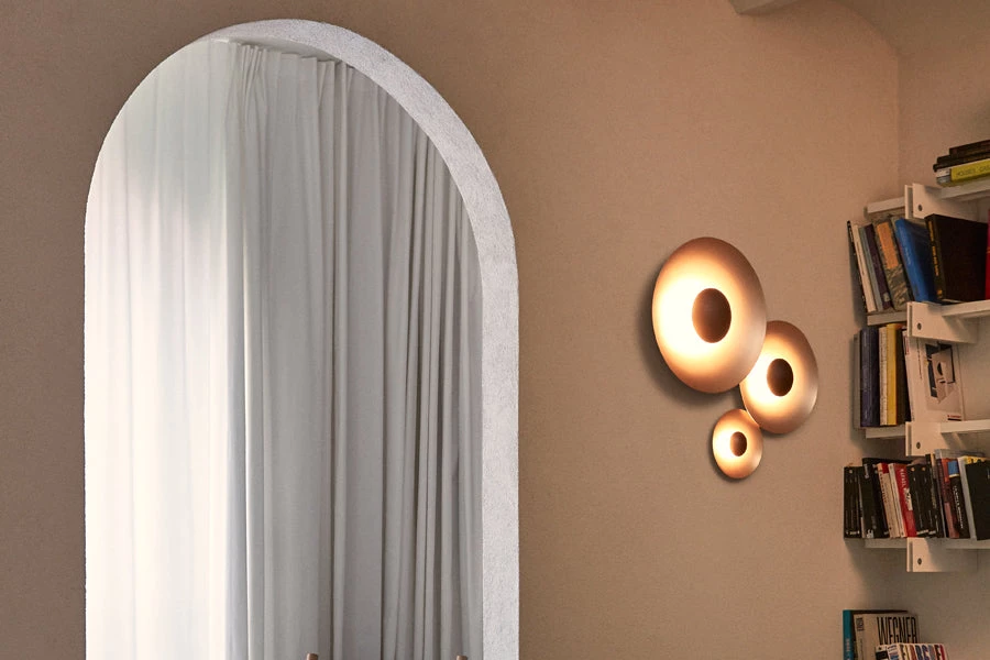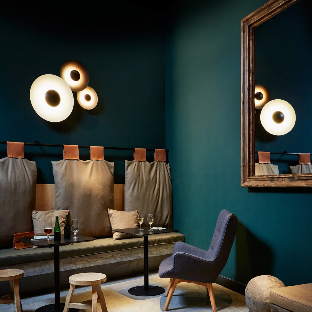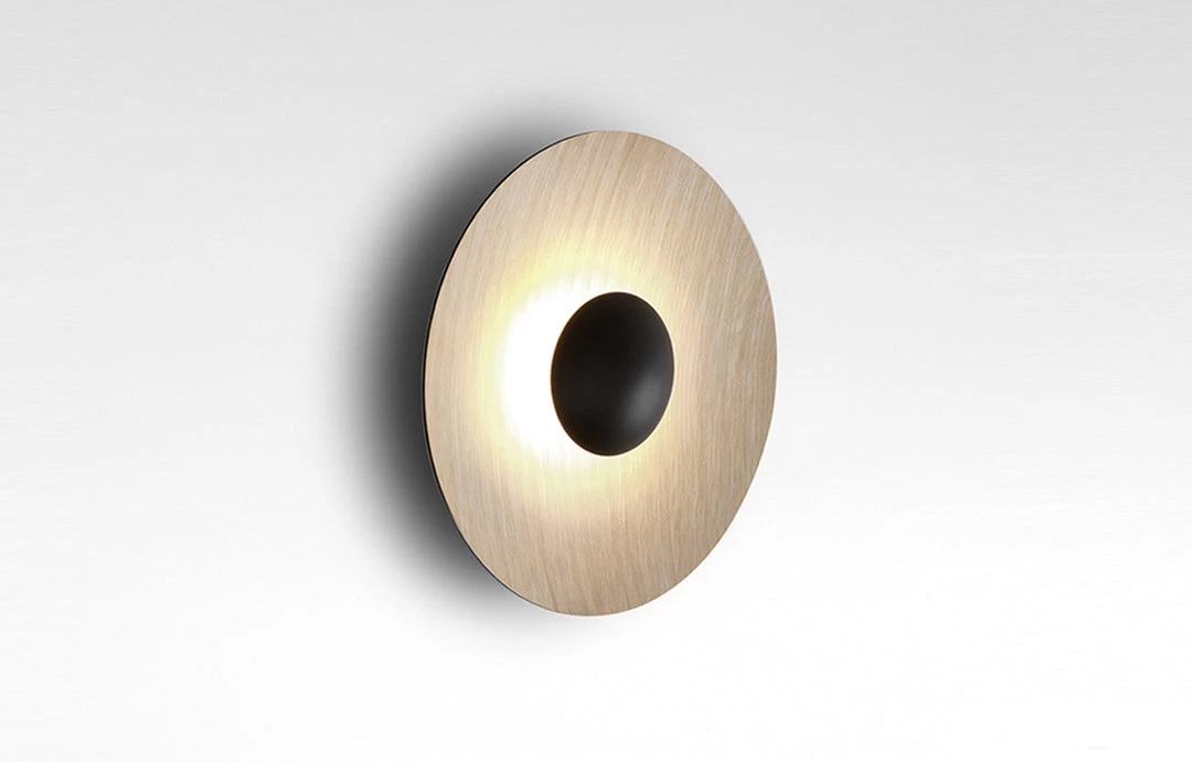 Wood is a great ally of cozy lighting. It is a material that is hard to mold, a challenge that the LED-Ginger collection neatly resolves. The combination of sheets of wood, paper and resins pressed together under high pressure achieves a laminate that appears almost entirely flat, which discreetly lights up spaces with indirect light. The LED-Ginger collection was born of wood, that great ally of cozy lighting. Sheets of wood, paper, and resins, compacted at high pressure, yielded a warm and intimate lamp. The LED-Ginger’s sleek, understated appearance and robust reflected light made it an immediate favorite. With the introduction of new metal shades, in black, white, or brushed brass finish, the Ginger offers the same warm, glare-free light to help emphasize your spaces. These metal shades offer a more refined option that is almost sculptural in its appearance. The extensive LED-Ginger collection numerous sizes of pendant, table (including the portable version), floor, and wall lamps, as well as a flush-mount version that can combined together in clusters of 2 to 3 fixtures, connected via an accessory to a single outlet box. In addition to white, the interior of the diffuser is available in oak, wenge and brushed brass finishes, yielding different hues of light. The LED-Ginger is an aesthetic, almost artistic design that offers a great visual effect in any finish.