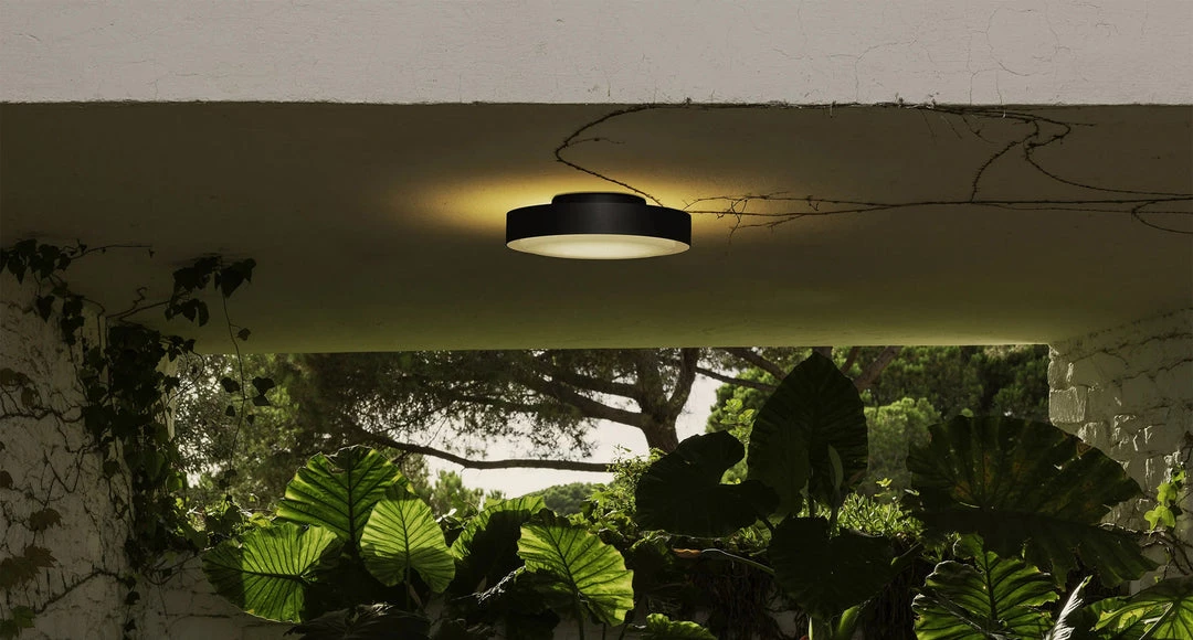 With the idea of expanding possibilities for the outdoors, the new Plaff-on! collection comes in two new sizes —13 and 20 inches in diameter — and two new designs that imply a change of direction in its lighting. On the one hand, the new outdoor wall Plaff-on! —6 inches in diameter— features a perpendicular mount to project the light downward while still allowing light to flow smoothly through the open top. On the other hand, now the Plaff-on! comes in a new bollard version as a step light or to be immersed in a garden. As with the standard Plaff-on!, the blown-glass diffuser of the outdoor versions seems to float, detached from the aluminium ring that surrounds it. Its light filters both downward and upward in a luminous halo, exuding simplicity and utility. A good design is one that endures. So it is with Plaff-on!, a lamp that has been illuminating walls and ceilings for almost ten years. Its hand-blown white glass diffuser appears to float, detaching from the ceiling and the circumference that surrounds it, and its light filters upward to create a luminous halo. It exudes simplicity and it’s very useful, so much so that there was a striking need to have this kind of lamp for exteriors as well. The Plaff-on! outdoor collection offer the same features as the indoor version but suitable for wet locations, making it perfect for bathrooms as well. Indoors, outdoors, with or without signage, the Plaff-on! now offers multiple options in one lamp that can now conquer the outdoors as well.