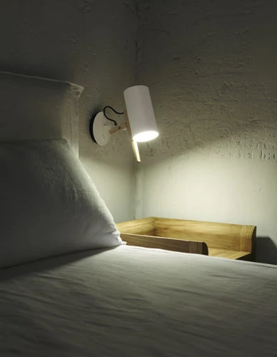 A combination of basic geometric shapes and the use of wood together with metal give this range of lamps a homely appearance, at the same time as a clearly defined personality. All of the movements of the fully rotating shade use arms and hinges, and its technical precision means that springs or counterweights are not necessary in order to maintain the selected position. Scantling is a term used to define the size to which a piece of wood or stone is measured and cut, derived from the name of an old unit of measurement. The interplay of the different elements used in its design gives this lamp an archetypal, almost graphic appearance.