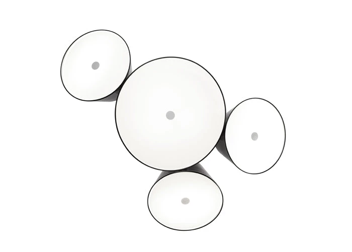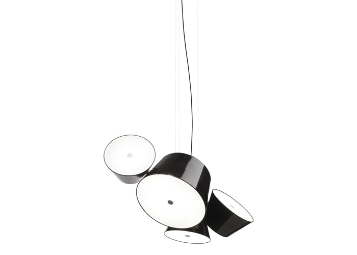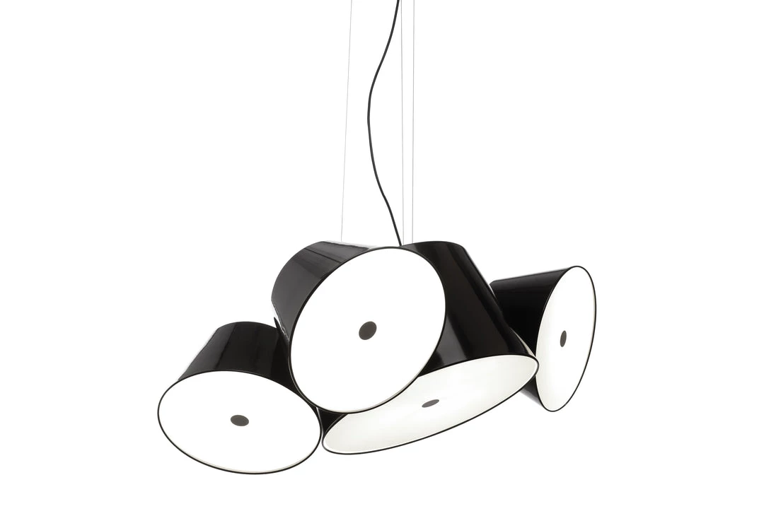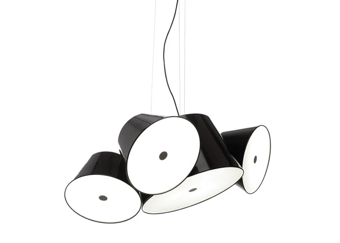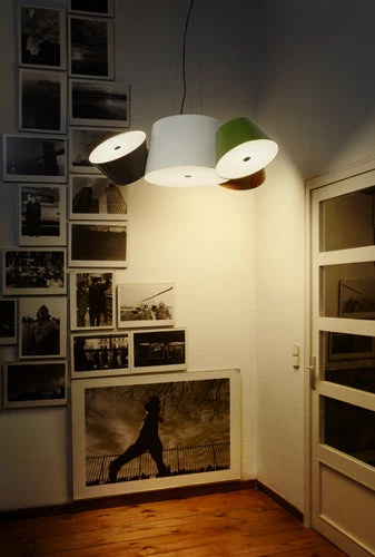 It’s a juicy bunch of grapes, Nick Mason’s drums from Pink Floyd, the constellation of Perseus…there are so many examples that could be used to describe the Tam Tam, a new perception in the world of lamps, which extols repetitiveness by focusing on the archetypal lampshade: a number of light sources pointed in different directions, geometrically arranged to invoke a feeling of organized chaos. The Tam Tam consists of a large central shade (50cm Ø) in lacquered aluminium, to which are attached various satellite shades (35cm Ø), which can be rotated through 360º by means of a swivel mechanism. An opalescent, methacrylate diffuser over the open end softens the light. Two models are available: with either 3 or 5 satellite shades. Each shade can be personalised in any of the followingcolours: black, white, orange, brown, green or gray.The Tam Tam is suitable for any space. Using more than one, the sets of shades with their different positions can be used to create vast, multi-coloured ceilings, each one di! erent from any other.