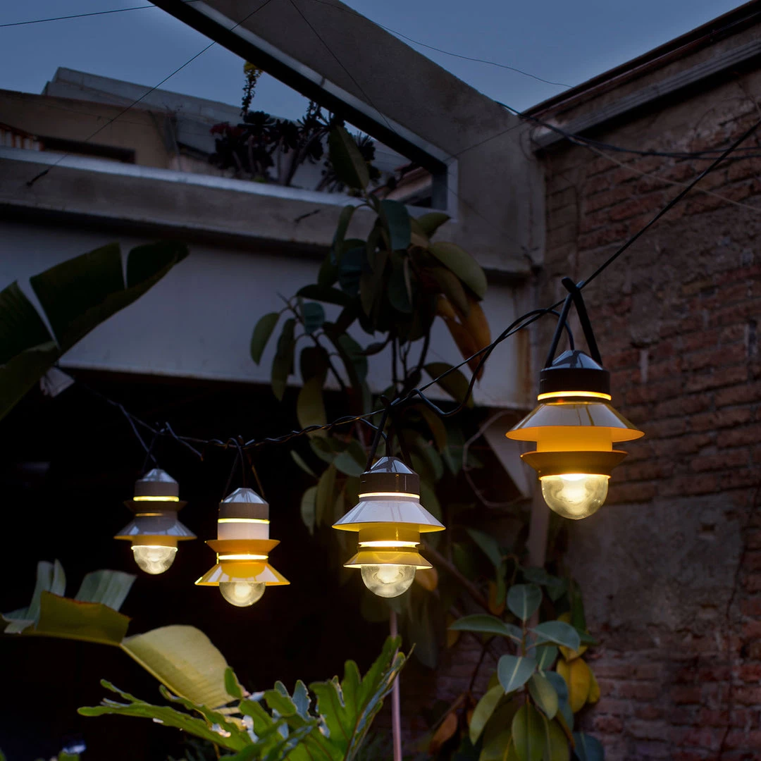 Inspired by the lanterns found on fishing boats, this collection of customizable outdoor lamps allows you to create multiple compositions. Users can choose how many shades to place on the diffuser, along with their order, position and direction. Available with white, grey, or mustard-colored shades, this interplay of combinations yields a rich array of direct or reflected light. The Santorini collection can be hung from the ceiling, either individually or clustered together, or they can be strung up like a garland. They also work as wall lamps or standing lamps using accessories that can easily be added. The Santorini is also available as a fixed-stem wall or ceiling fixture. The metal stem provides rigidity to the light, improving its usability in outdoor applications and lending the fixture a more solid appearance.