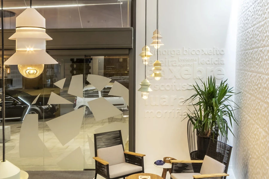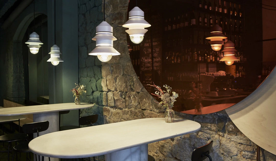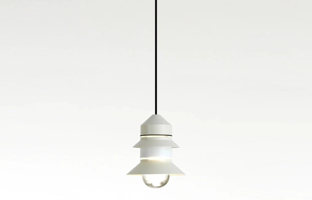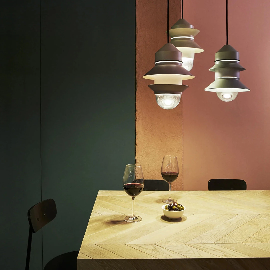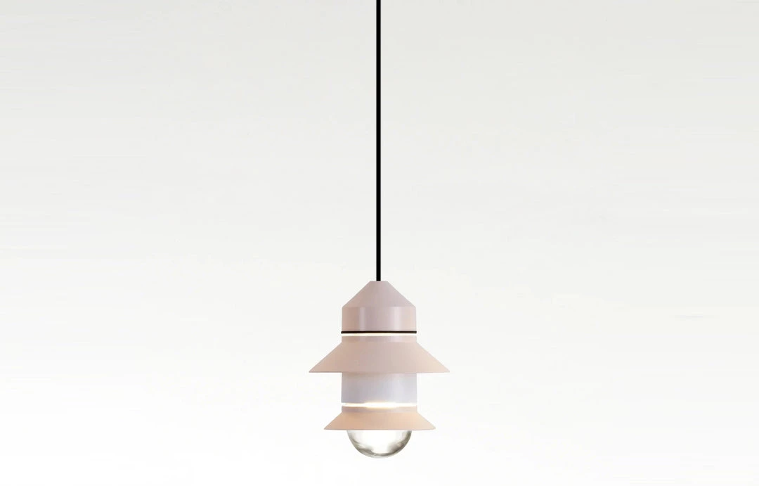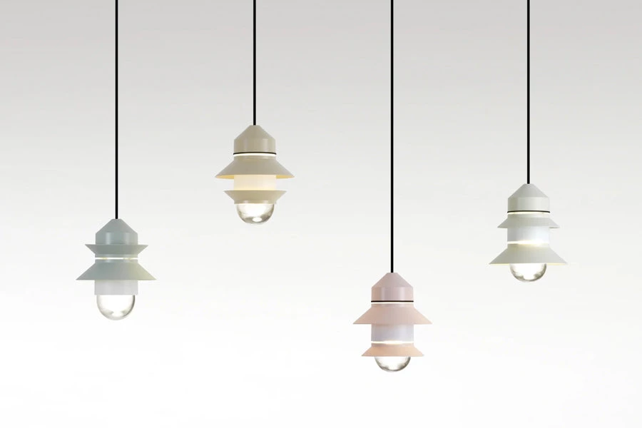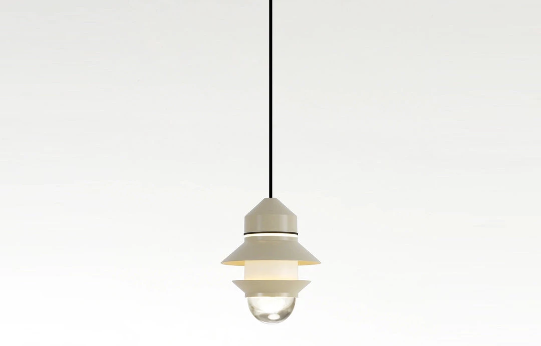 Inspired by the lanterns found on fishing boats, this collection of outdoor customizable lamps allows you to create multiple compositions. Users can choose how many shades to place on the diffuser, along with their order, position and direction. This interplay of combinations yields a rich array of direct or reflected light. This collection remains rich in its nuances and shapes by allowing the user to position the shades, creating different lighting arrangements. As such, with the Santorini Indoor the light can still be direct or reflected, simply and easily, with shades in four comforting colors: soft pink, clear green, sand or off-white. The new cloth cable gives it an appropriate softness and elegance. The variations on the Santorini lamp are further expanded by the choice of the shade color, which comes in white, grey and mustard.